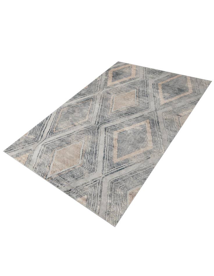 A layered geometric pattern of interlocking diamonds rests on a gray cream background, giving the rug a calm, architectural presence. Striated, sculpted lines in silver and beige radiate from each diamond, while the inner fields show a dense, pebble-like texture that adds subtle contrast and depth. The palette of gray cream, beige, and silver keeps the overall look neutral and versatile, with enough variation to add interest without overwhelming a room.