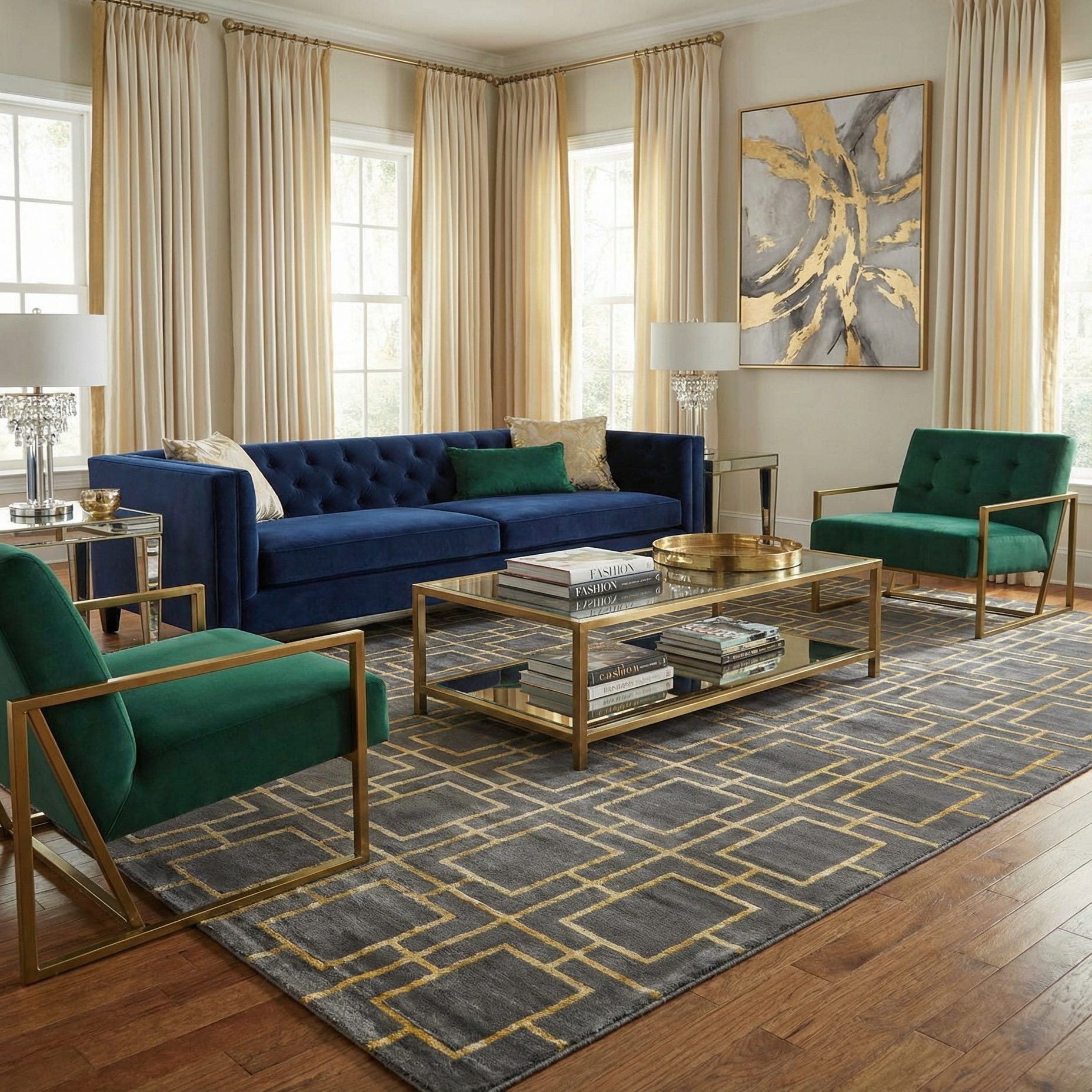 Ideal for anchoring a generous living room or positioning beneath a dining table, this rug brings order and metallic warmth to open-plan spaces. Pair it with mid-century or contemporary furnishings and brass or gold-toned accents for a cohesive look, or let it ground neutral upholstery and textured throws in a bedroom or home office to introduce pattern and depth.