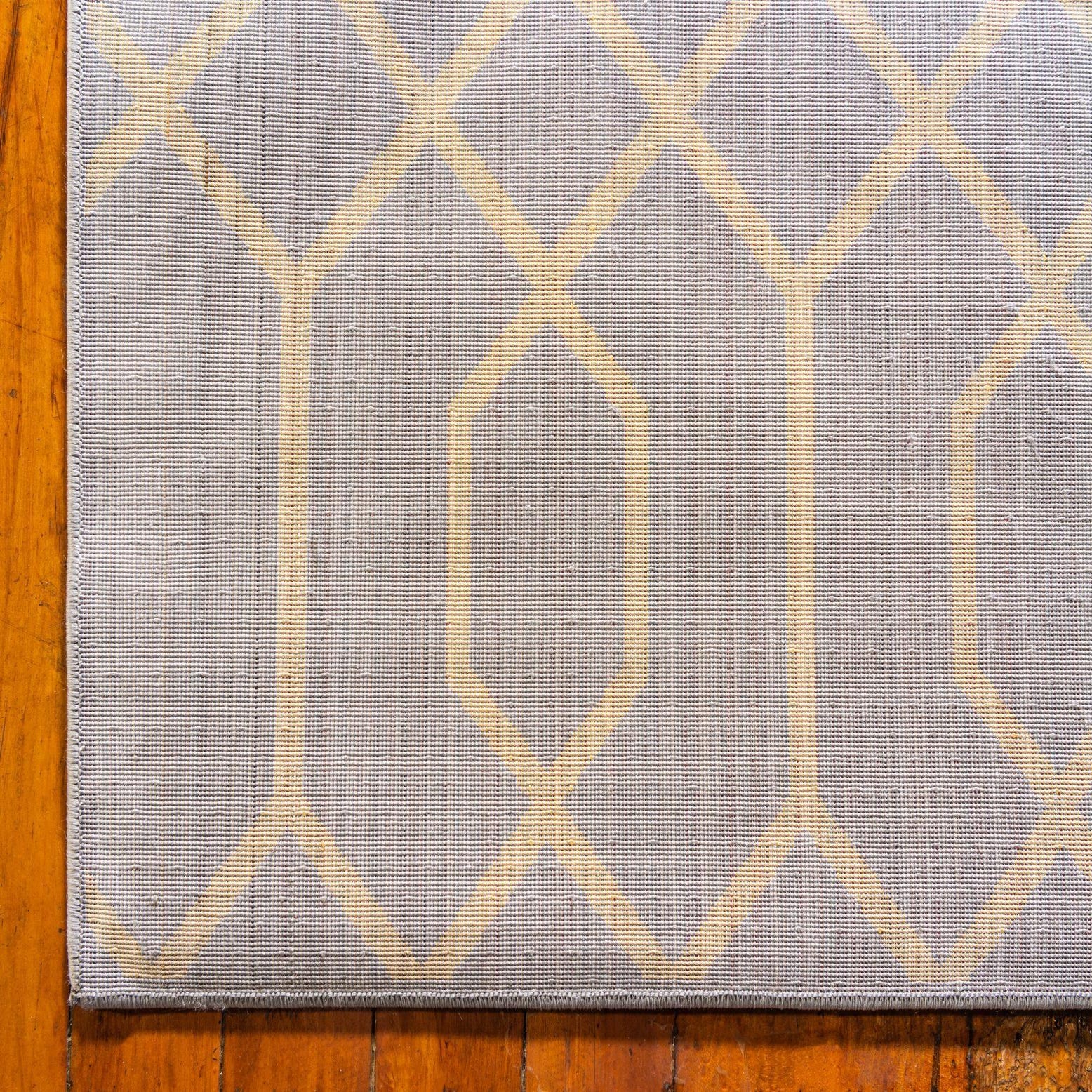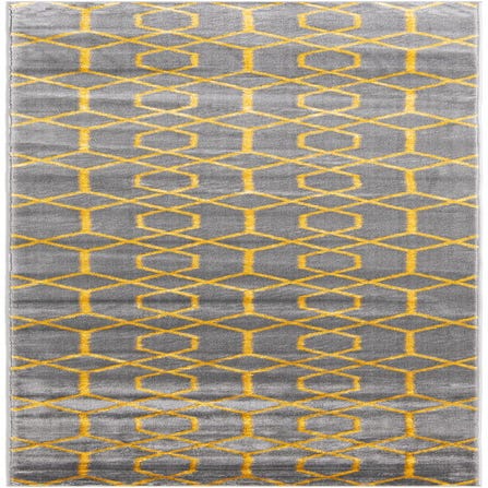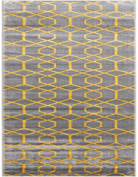 A 12 ft runner rug with a gray background and a bright yellow Hollywood glam trellis pattern, ideal for a hallway.