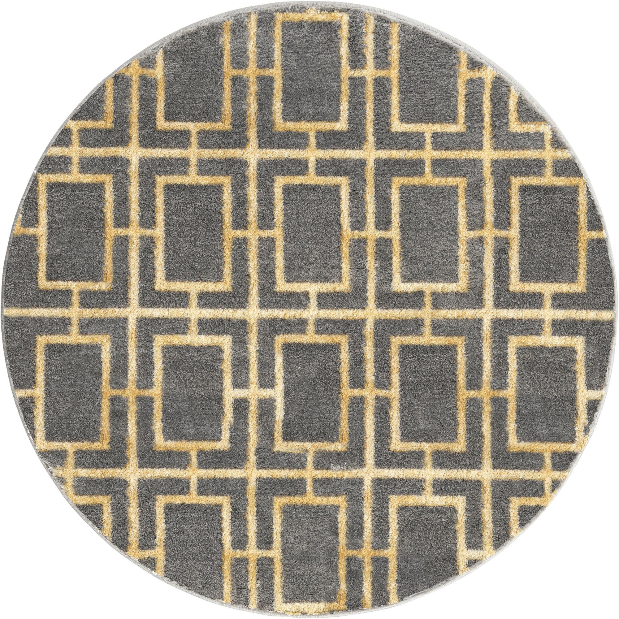 A geometric trellis of interlocking rectangles and clean lines maps across a warm Gray Gold field, with the linear motif rendered in a soft Gold that catches light for subtle contrast. Machine made from 70% polypropylene and 30% polyester, the rug has a low-to-medium pile that feels soft underfoot and offers a slight sheen from the polyester fibers. The round shape and rhythmic pattern create a tailored, modern look with a touch of glam.