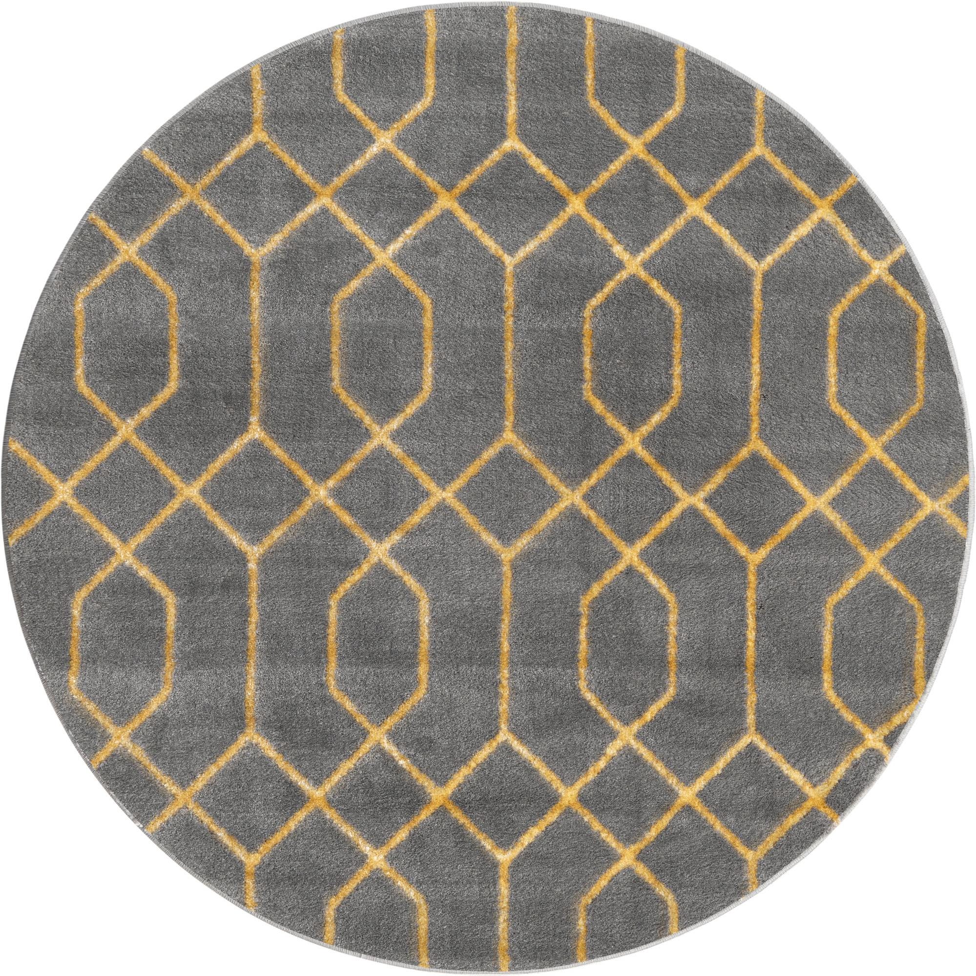 A round area rug with a repeating trellis pattern rendered in warm Gold lines against a Gray Gold background. The lattice motif forms elongated hexagons and connected diamonds for a clean, geometric look that balances modern and classic sensibilities. Machine-made from 70% polypropylene and 30% polyester, the surface has a soft, smooth hand with a subtle sheen from the polyester that keeps the pattern crisp while offering comfortable underfoot texture.