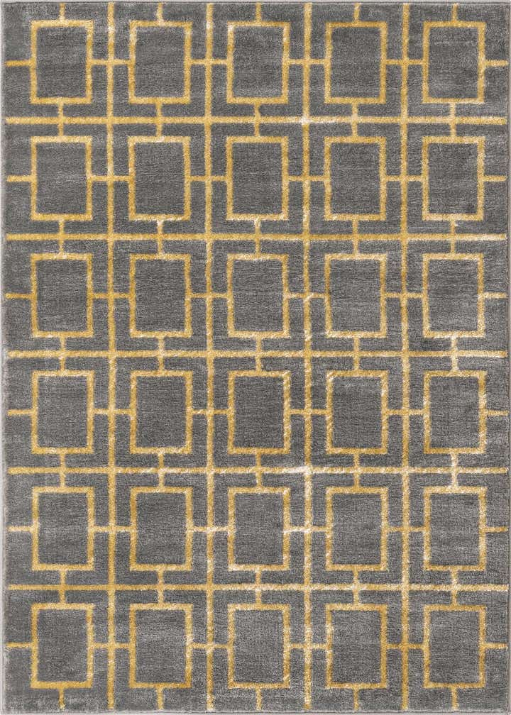 Machine made from 70% polypropylene and 30% polyester, the rug has a low-to-medium pile that feels soft underfoot with a gentle, slightly plush hand and a faint sheen where the polyester highlights the gold. Place it as an accent in a living room beneath a coffee table, in a home office to anchor a desk and chair, or beside the bed to introduce pattern and warmth to a glam or contemporary bedroom. It also works well in entryways or layered over a larger neutral rug to add structure and subtle shine.