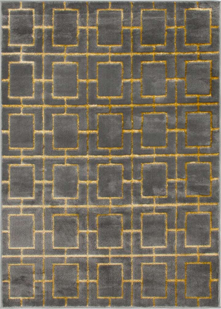 A 4x6 rectangular gray rug with a raised gold trellis pattern, featuring interconnected squares, perfect for a modern living room.