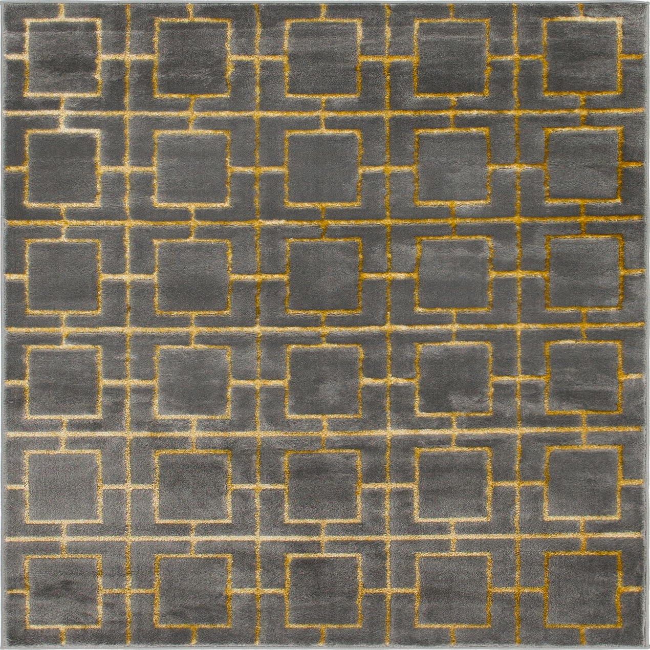 A repeating geometric trellis of stacked rectangles sits crisply against a Gray Gold field, the pattern defined by brighter Gold lines that add a metallic contrast and subtle dimensionality. Machine made from 70% polypropylene and 30% polyester, the rug has a soft, velvety pile with a gentle sheen on the gold accents while the gray-gold background offers a plush, matte feel underfoot. The rectilinear motif and paired tones give the piece a contemporary, refined look that reads clean and orderly in a room.