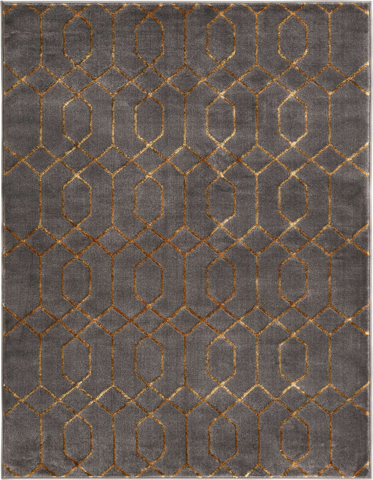 A geometric trellis pattern in warm Gold traces a repeating chain across a Gray Gold field, creating a structured yet refined look. The raised Gold motif catches light against the muted Gray Gold background, giving the surface gentle visual depth. Machine made from 70% polypropylene and 30% polyester, the rug has a low, dense pile that feels smooth underfoot with a soft, slightly lustrous hand where the gold yarns lift from the ground.