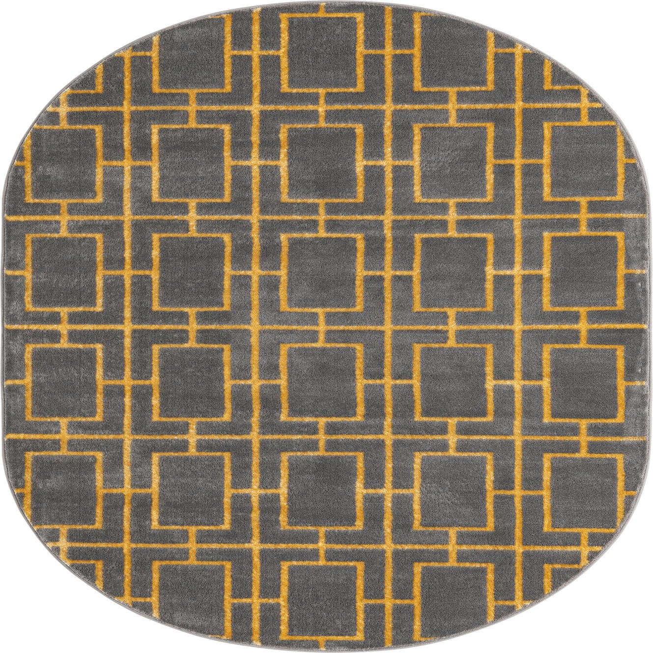 An oval gray rug with a bold, interlocking gold trellis pattern, featuring a textured, high pile.