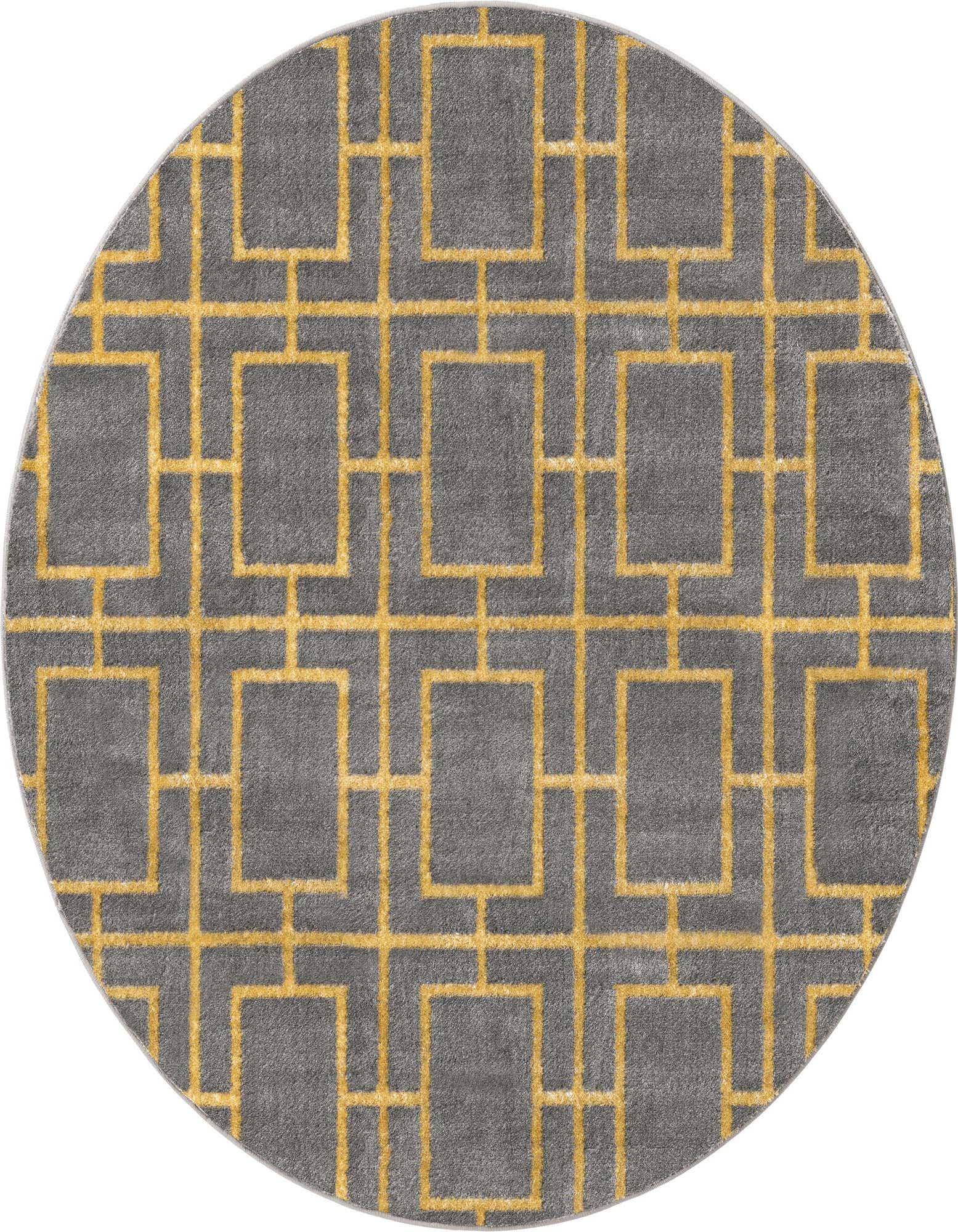 A 5' 3 x 5' 3 round gray rug with a bold gold Hollywood Glam trellis pattern, featuring a textured pile.