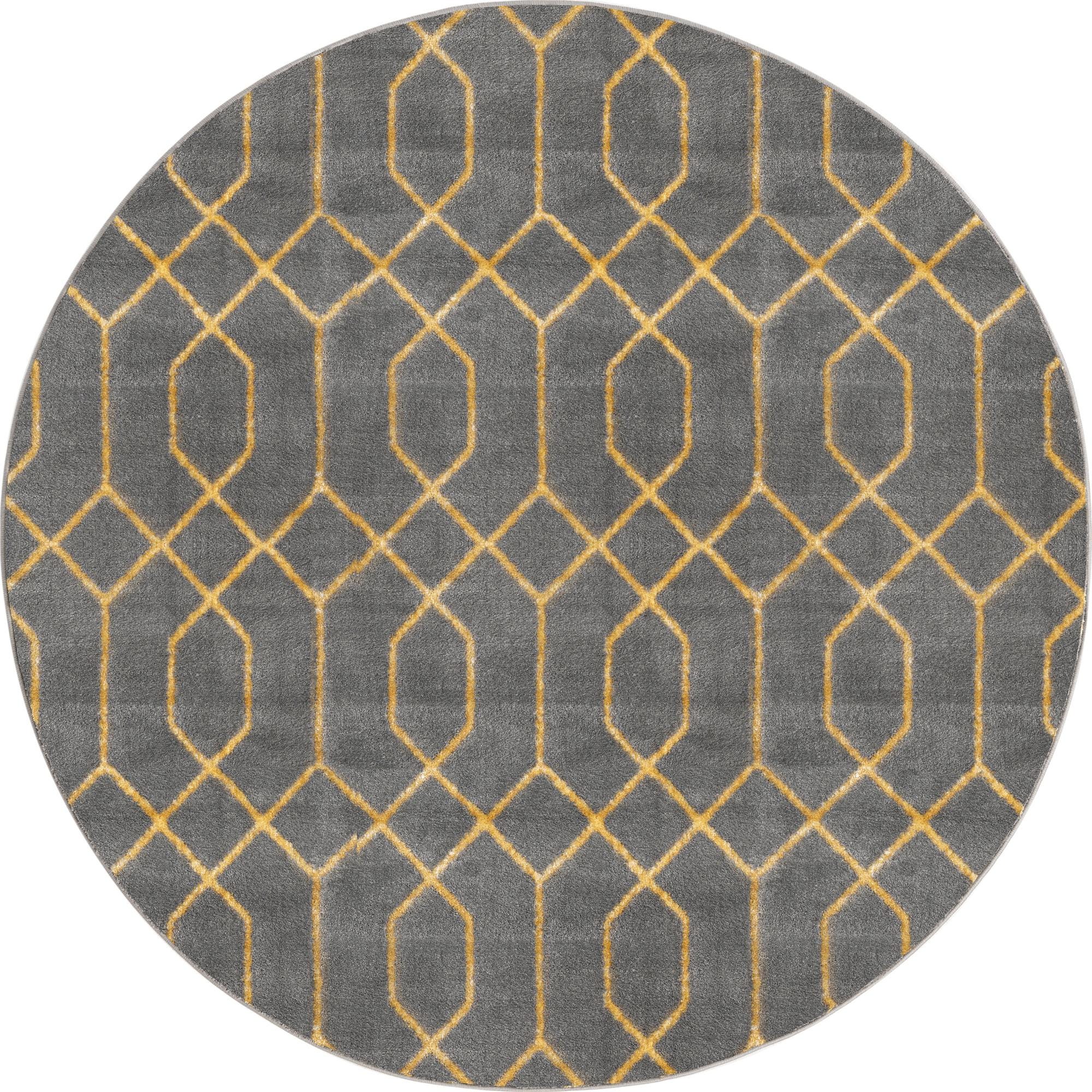 A 5' 3 round gray rug with a modern gold trellis pattern, featuring a textured, high pile.