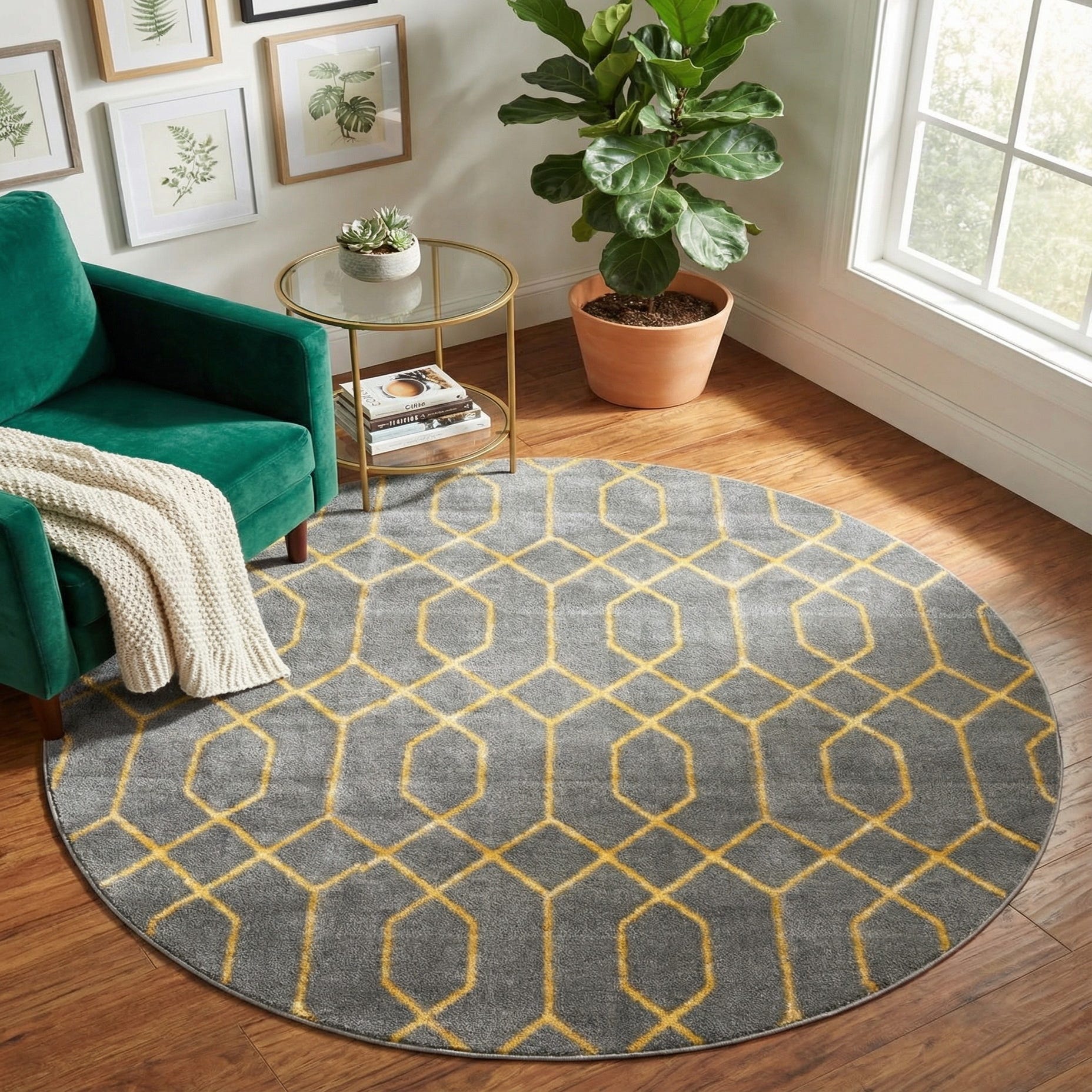 Machine made from 70% polypropylene and 30% polyester, the rug has a dense, low-profile pile with a soft hand and a gentle sheen where the gold fibers catch the light. Its round shape makes it well suited to anchor a small seating area, sit beneath a round dining or bistro table, or add a touch of pattern to a bedroom or dressing area. Complement it with brass or black metal accents, velvet upholstery, or streamlined modern furnishings for a cohesive contemporary look.