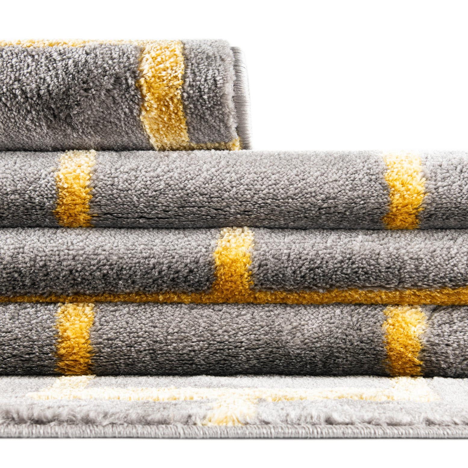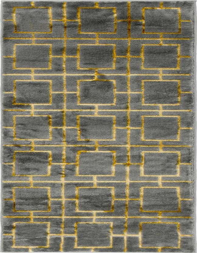 A modern geometric trellis of gold rectangular outlines sits crisply against a Gray Gold field, creating a structured, architectural repeat that reads contemporary with a touch of glam. The machine-made construction (70% polypropylene, 30% polyester) yields a plush, velvety pile with a subtle sheen; the gold motif is slightly lustrous and feels smooth beneath your hand while the Gray Gold background offers a soft, muted contrast.