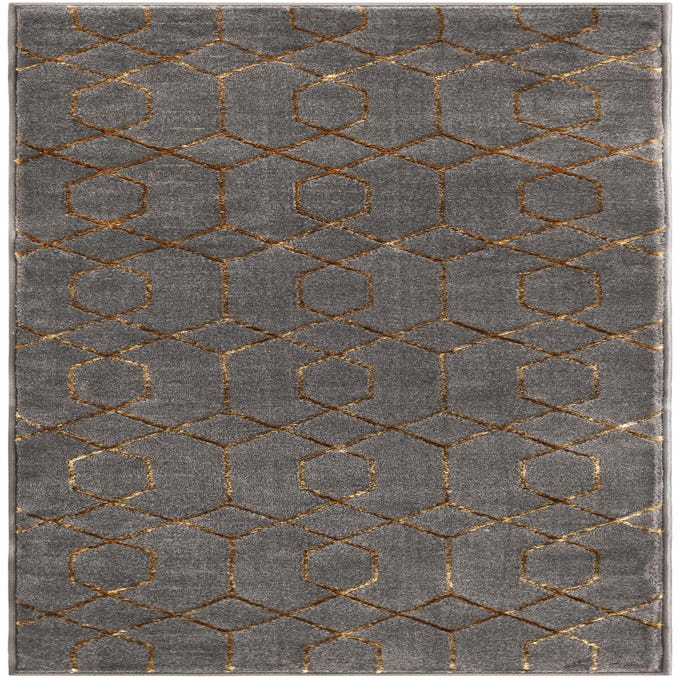 A refined geometric trellis of elongated hexagons and intersecting diamonds is worked in warm Gold against a Gray Gold background. The Gold yarns sit slightly raised, catching light to produce a gentle metallic sheen that contrasts with the matte Gray Gold field. Machine made from 70% polypropylene and 30% polyester, the runner has a low-profile, tightly tufted face that feels smooth underfoot with a subtle plush hand and a consistent, even texture.