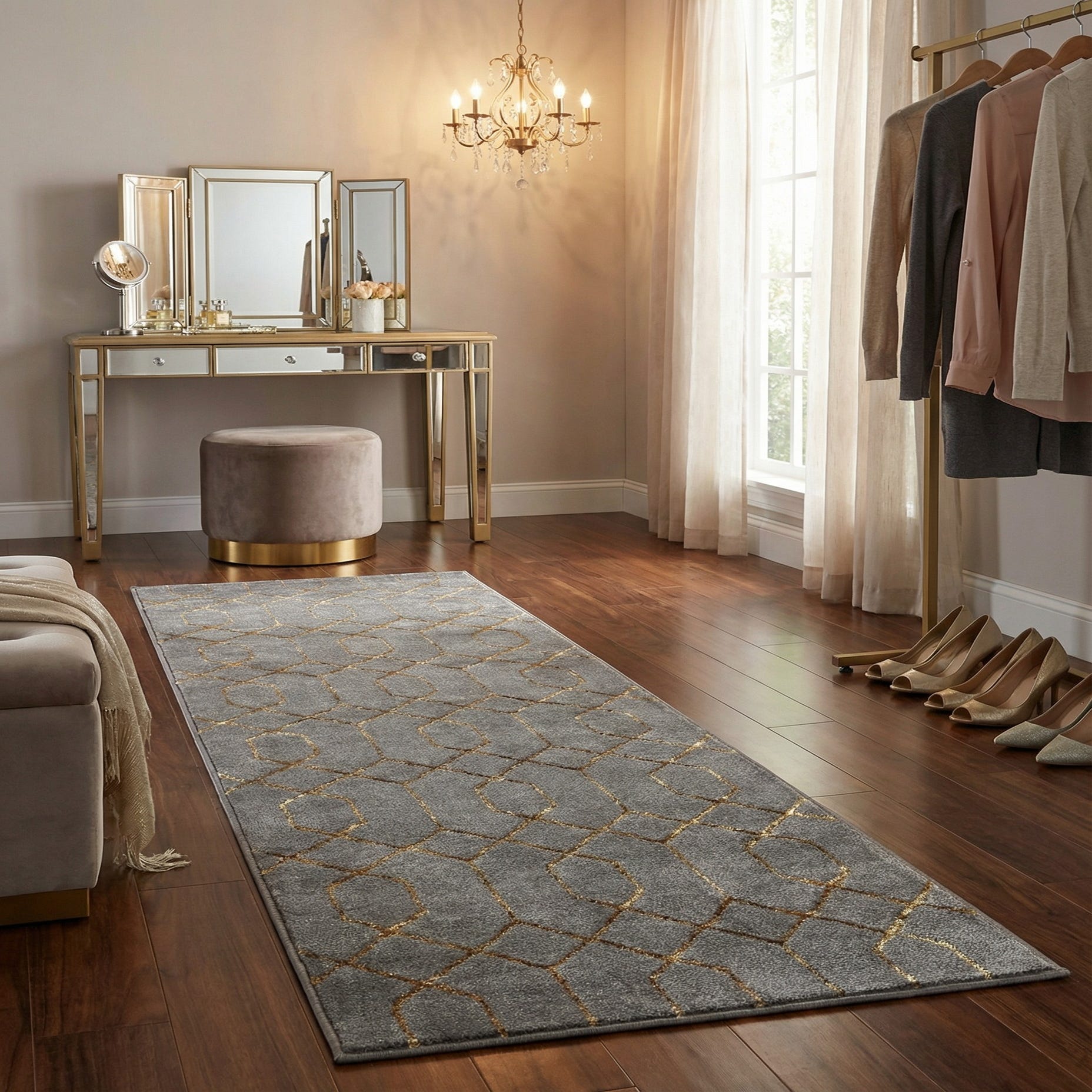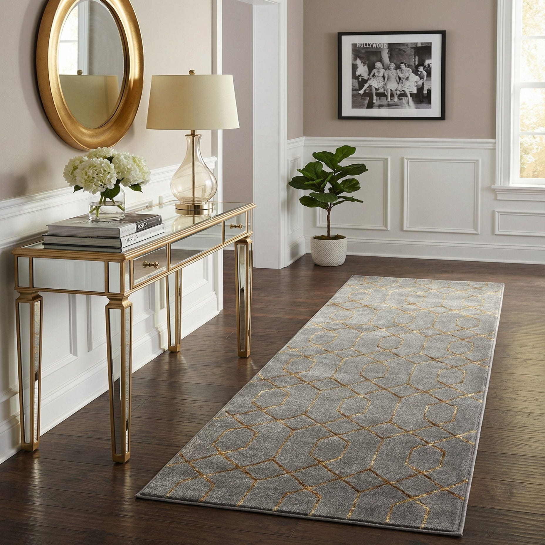 Ideal for hallways, entryways, or placed alongside a bed, this runner suits contemporary, modern-glam, and transitional interiors. Pair it with brass or gold-finish accents, neutral upholstery, and warm wood tones to emphasize the metallic highlights, or layer it over cool-toned floors to introduce pattern and visual warmth without overwhelming the room.