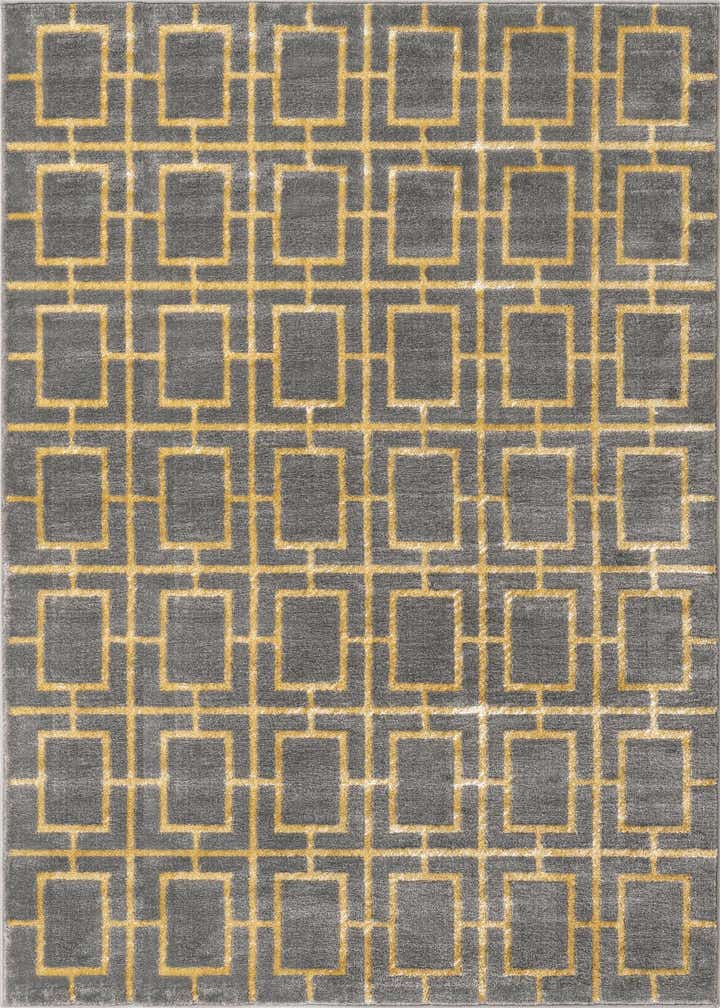 A 6x9 rectangular gray rug with a modern gold trellis pattern, featuring a textured pile.