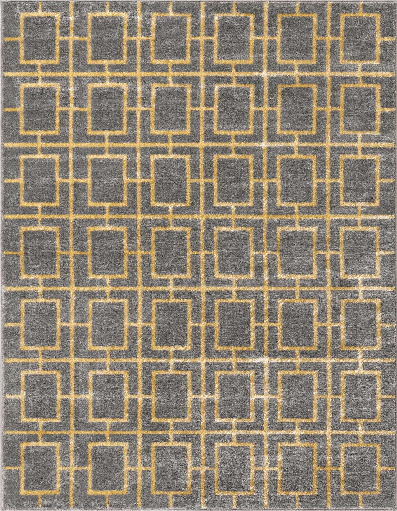 A structured trellis of interlocking rectangles in warm Gold sits crisply against a Gray Gold background, creating a modern geometric pattern with a touch of polish. The repeating rectangular motif gives the rug a tailored, architectural look that pairs well with clean-lined furniture, while the Gold accents bring a soft metallic pop without overpowering a room's palette.