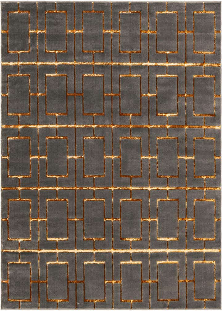 A square gray area rug with a raised, textured gold trellis pattern forming interconnected squares, suitable for a modern living space.