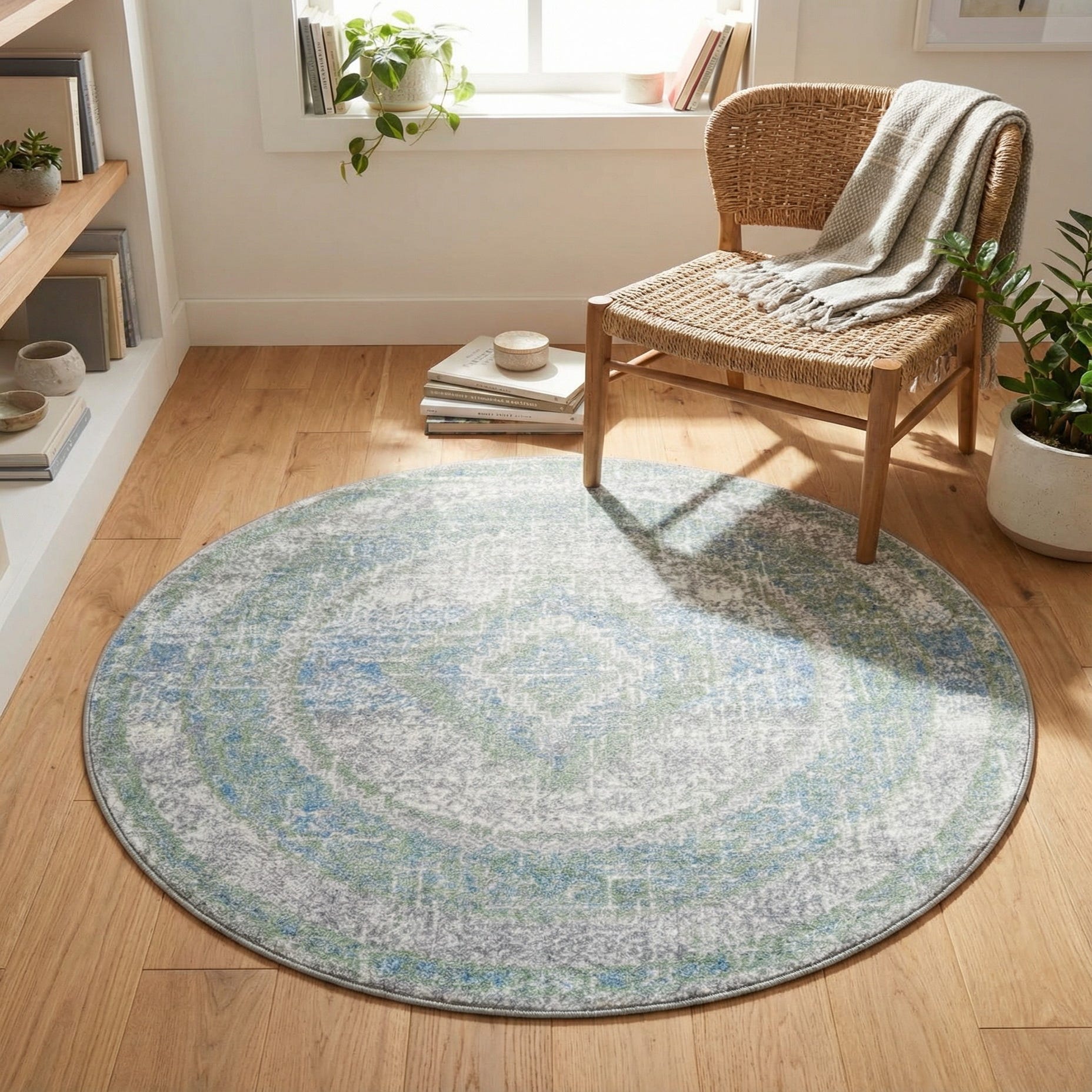 A soft, low-contrast medallion pattern gives this round rug a gently worn, vintage-inspired look. The Gray Green background provides a muted, soothing base while Ivory accents trace the concentric medallion and geometric center, creating subtle movement across the surface. Machine-made and constructed from 100% polyester, the pile feels soft and slightly velvety underfoot with a smooth, even texture that reads calm and collected in a room.