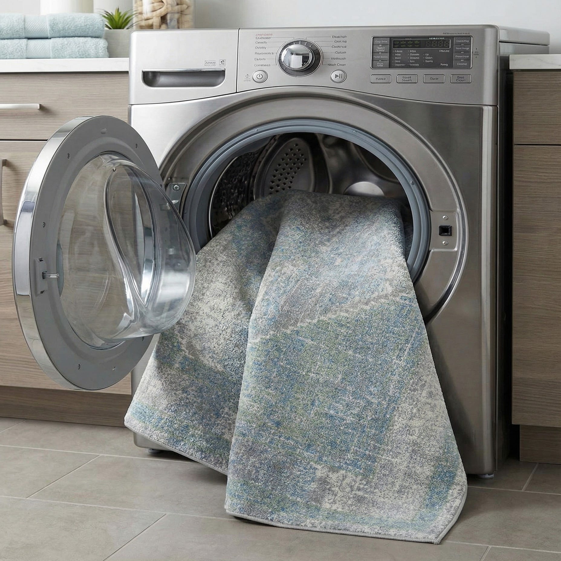 8x10 rectangular Kamala Washable rug featuring a distressed traditional medallion pattern in shades of gray, silver, and muted green.