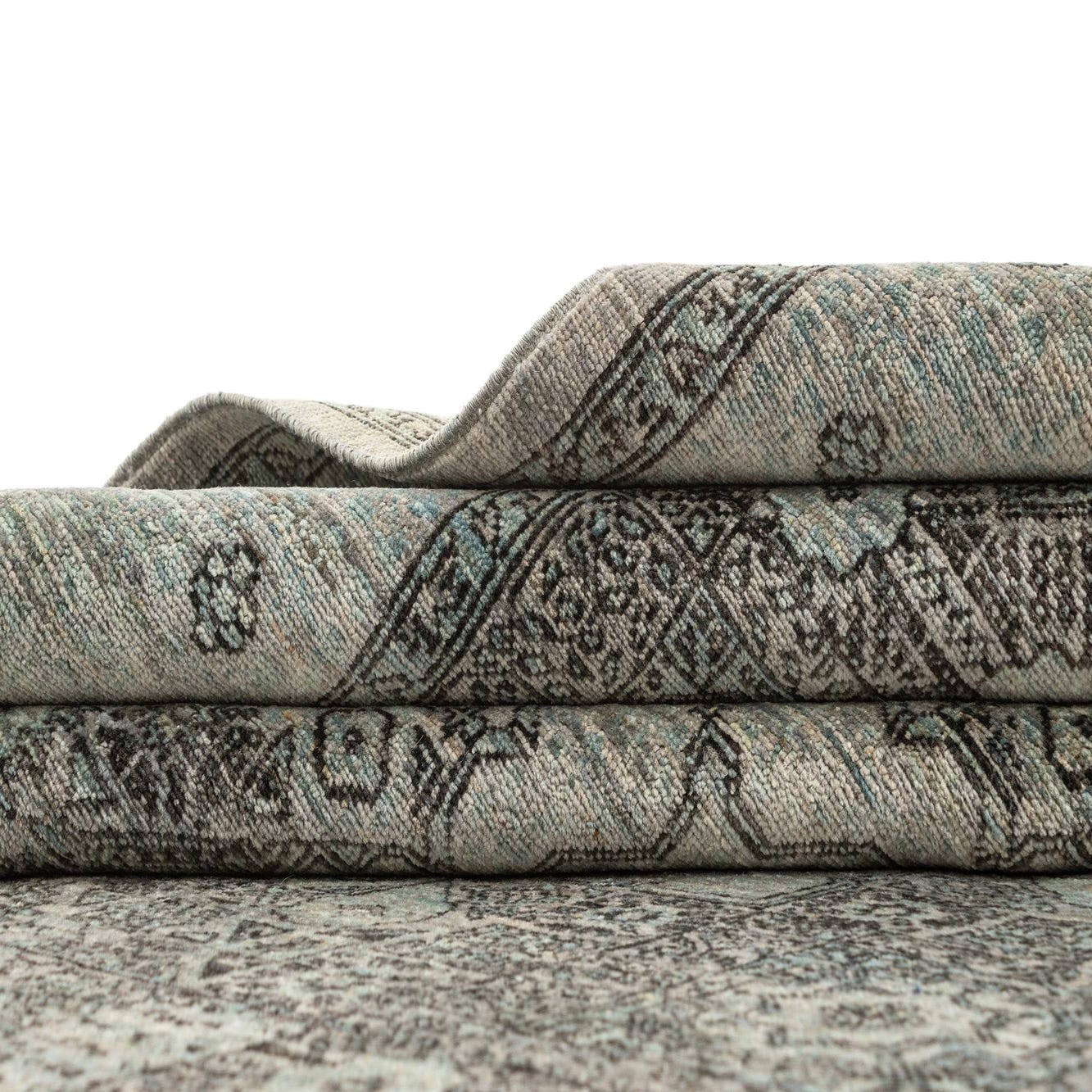 A rectangular gray Persian wool rug with intricate traditional patterns and a distressed finish, suitable for an indoor living space.