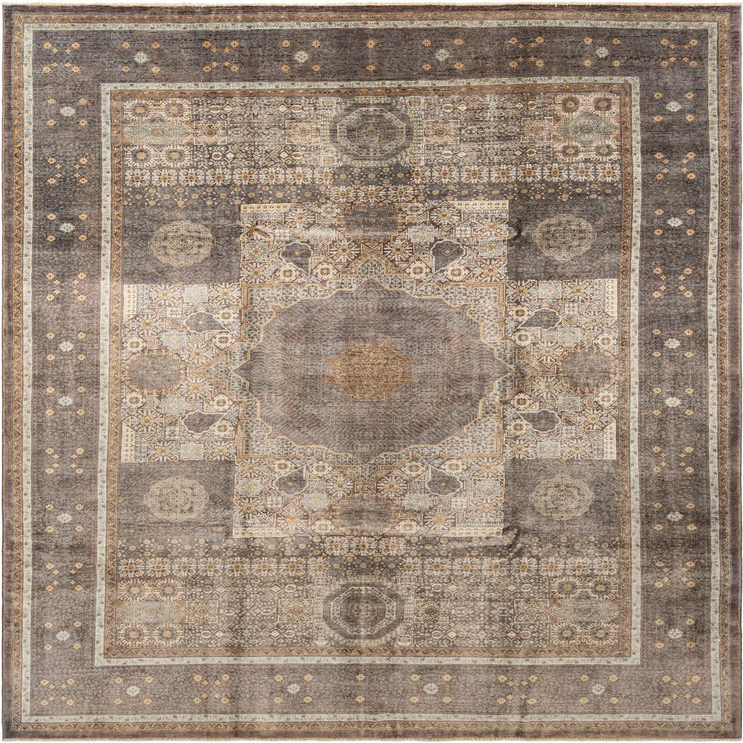 A rectangular handmade Persian rug in shades of gray and silver with intricate traditional patterns.