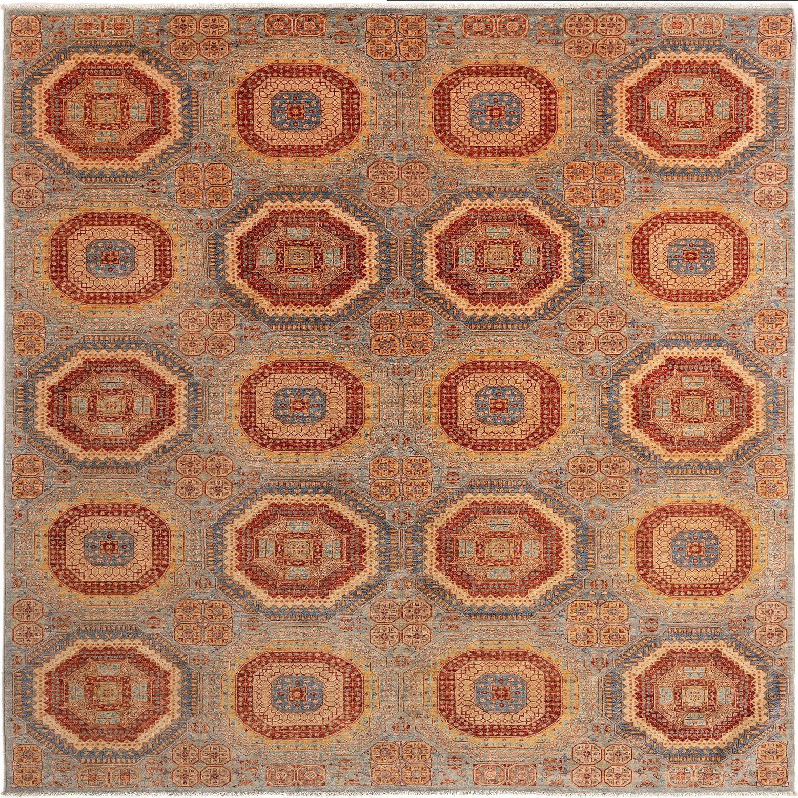 A rectangular handmade Persian rug with a gray background and repeating octagonal medallions in red, blue, and gold.