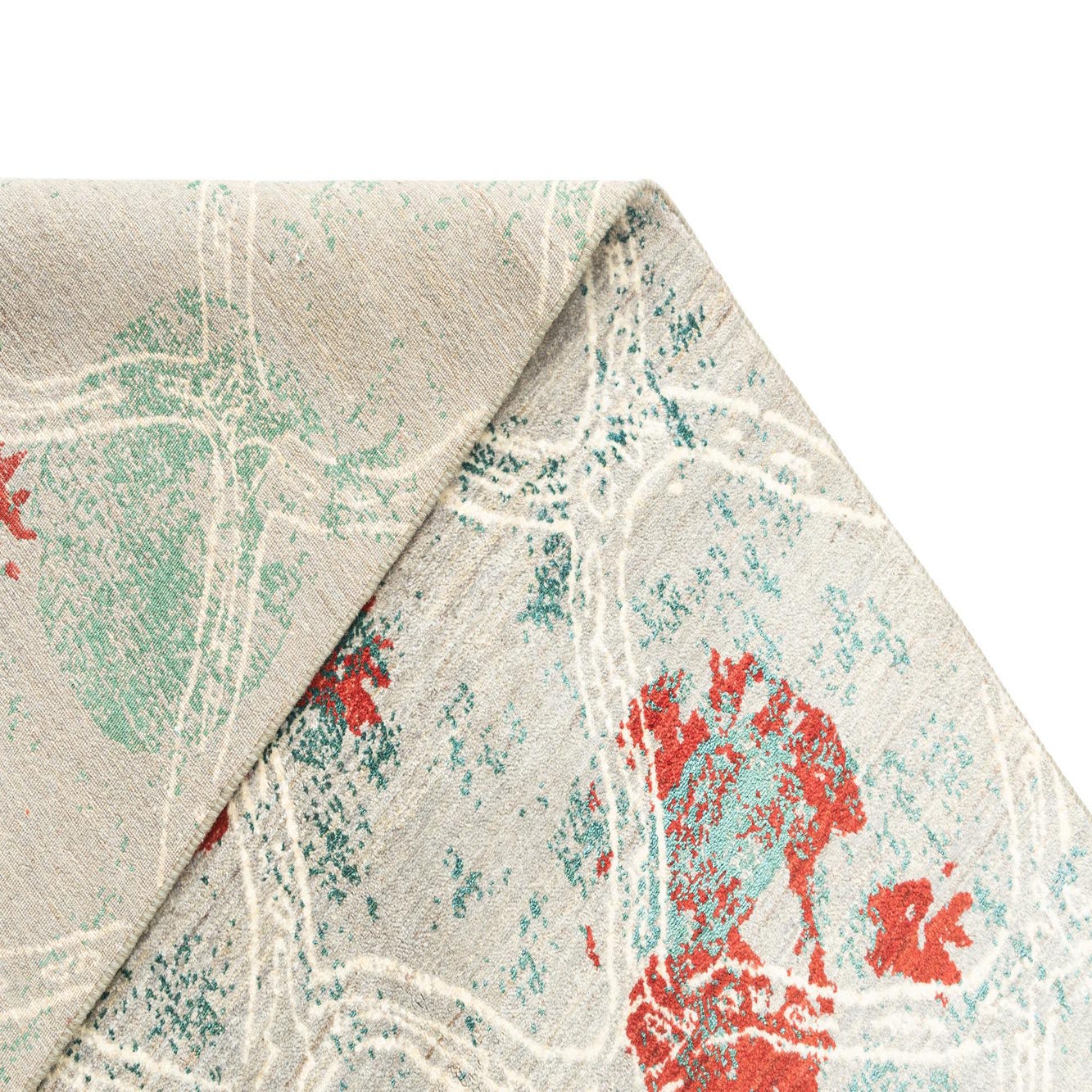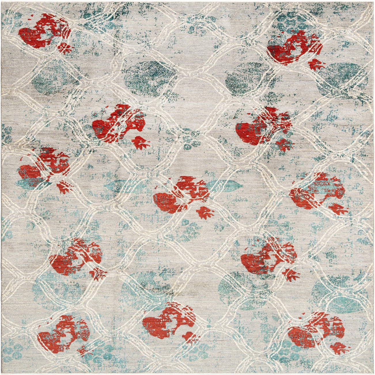 Rectangular Anar Collection rug by Rugs.com featuring a gray base with distressed red floral motifs and teal accents, overlaid with a subtle white geometric lattice pattern.