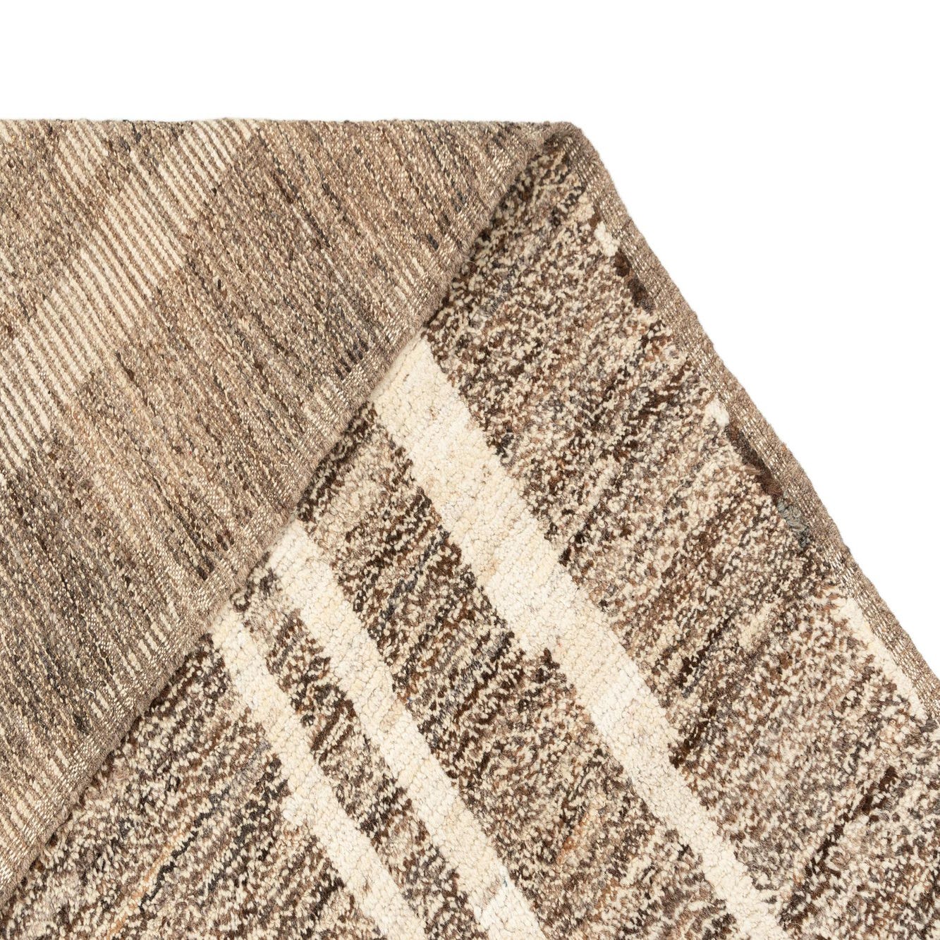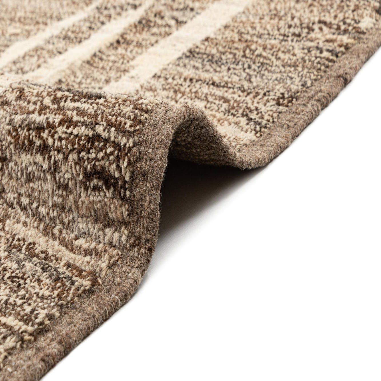 Handmade from wool, the surface has a natural, slightly nubby texture with a soft, grounded feel underfoot and a subtle tonal variation from the wool’s spun fibers. Place it to anchor a modern living room beneath a sofa and coffee table, layer it in a transitional dining space to add visual interest beneath a wooden table, or use it in an entry or home office where its neutral tones will coordinate with warm woods, matte metals, and textured upholstery.