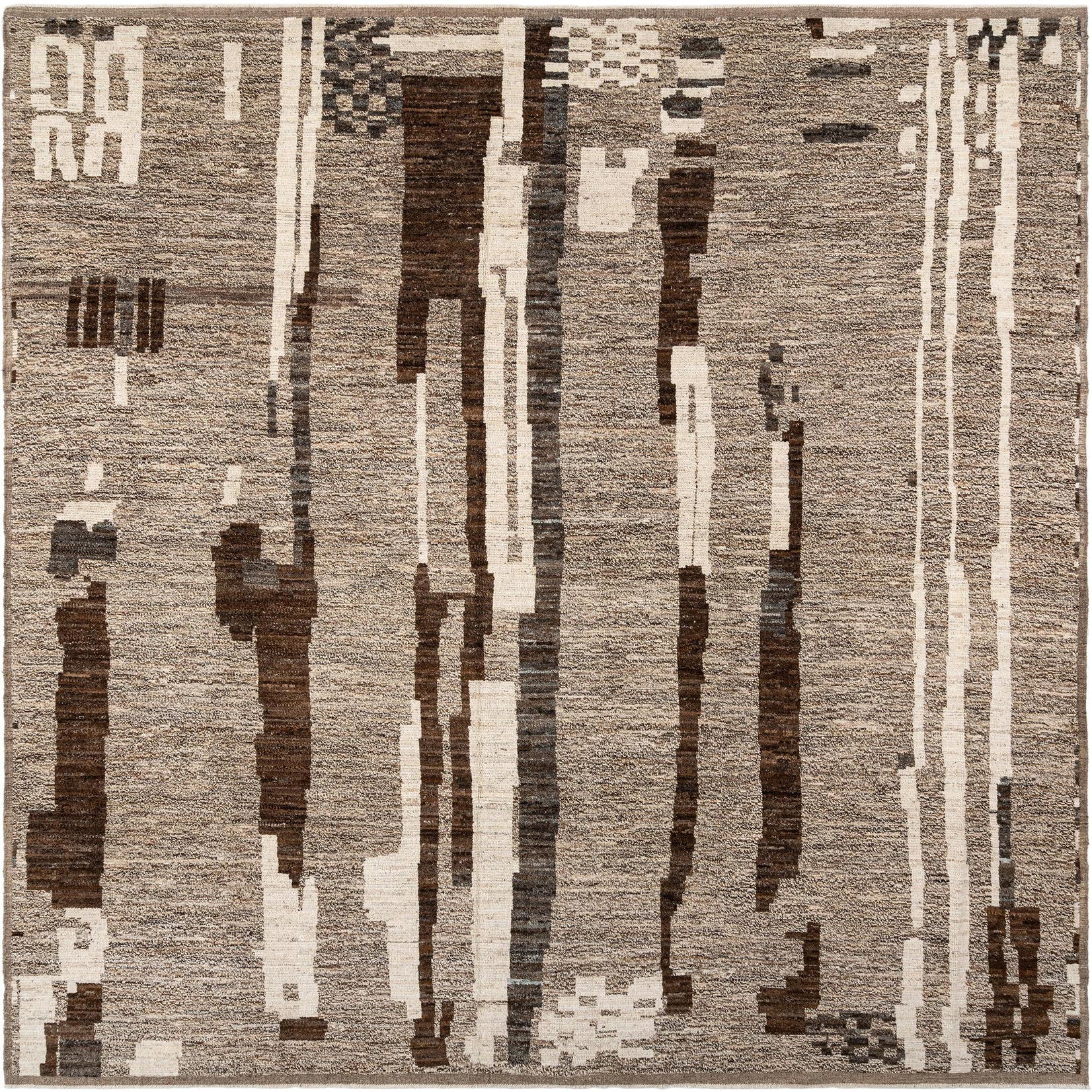 This hand-knotted wool rug displays an abstract, linear composition across a warm gray field. Irregular vertical bands in deep chocolate and creamy ivory rise and fall against the textured gray background, while small pixel-like accents break up the lines for a contemporary, collected look. The rectangular silhouette and restrained palette make the pattern readable from any angle without overwhelming the room.