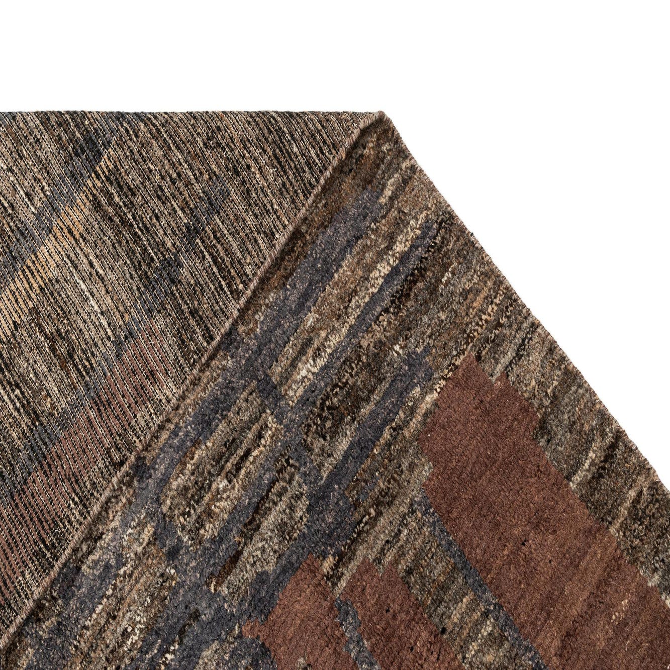 A rectangular Beni Marok Persian rug featuring an abstract pattern in shades of gray, silver, brown, and beige.