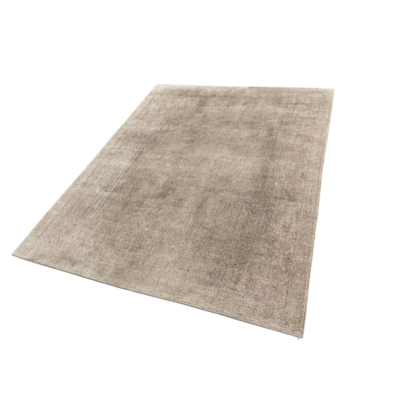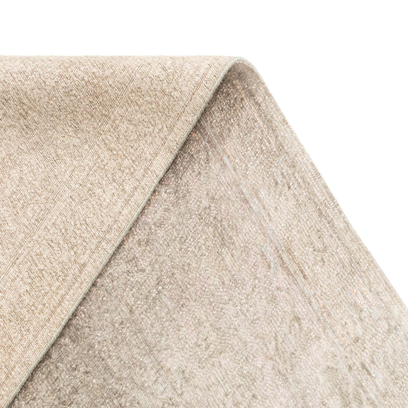 A handmade rectangular gray Persian silk rug with a subtle, distressed traditional pattern, suitable for indoor spaces.
