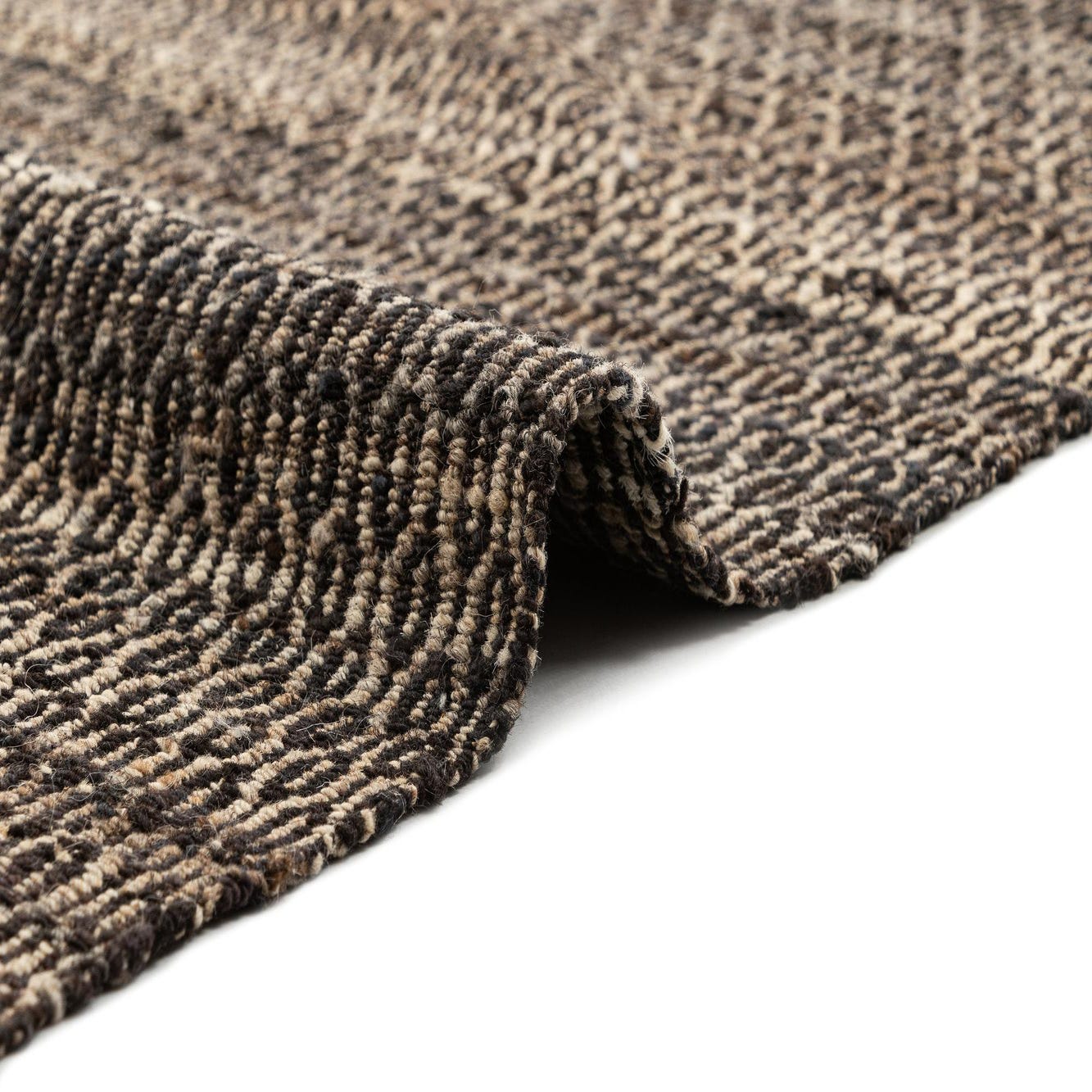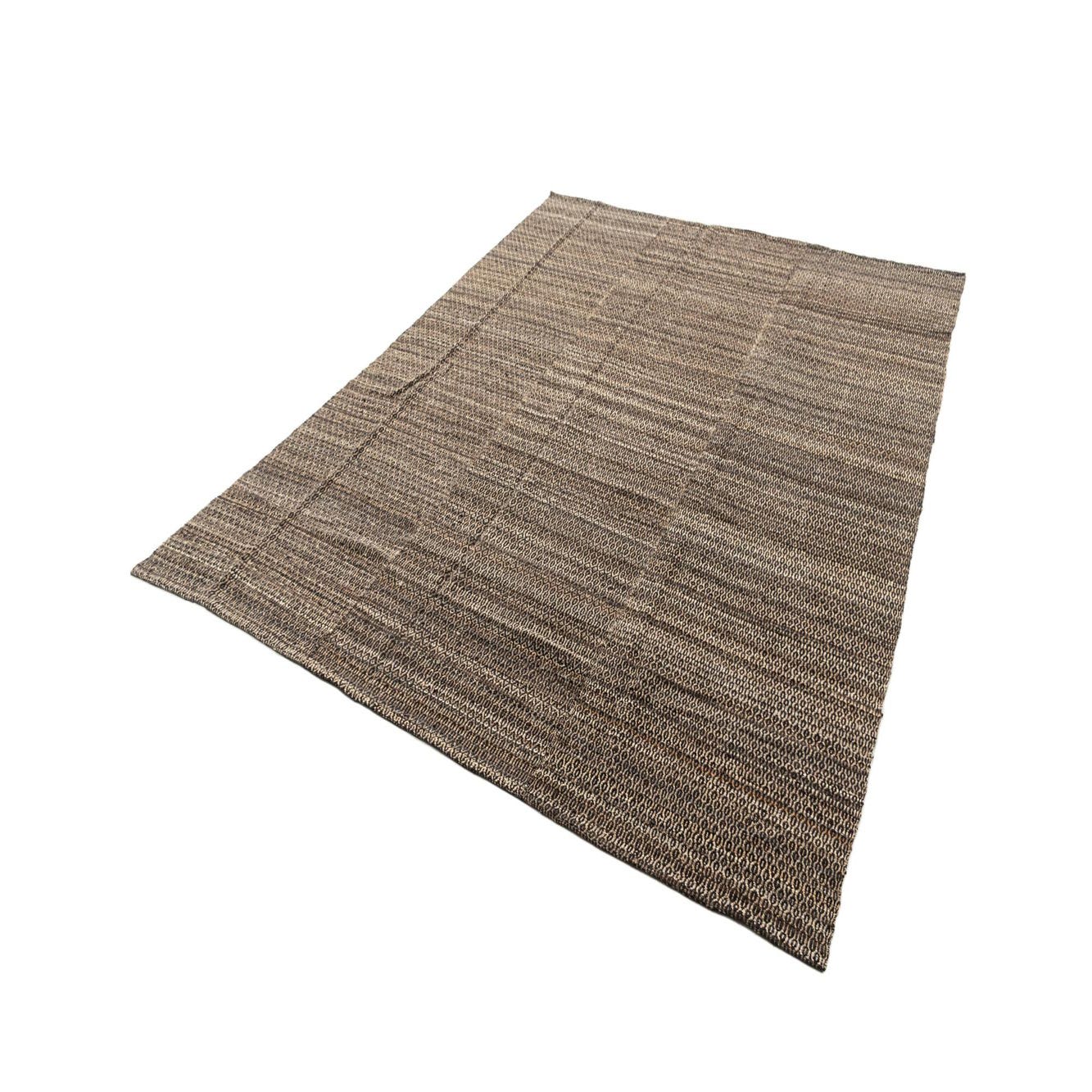 A rectangular handmade gray wool flatweave rug with a subtle tribal pattern, suitable for indoor use.