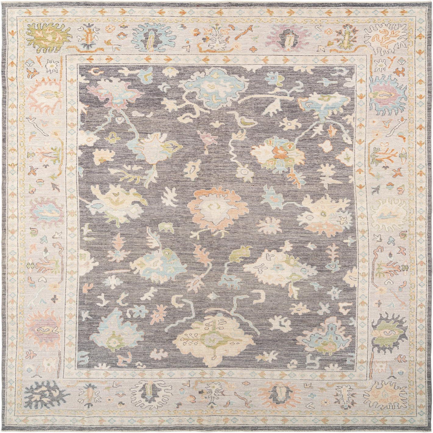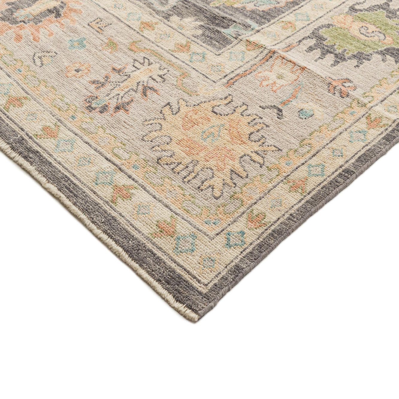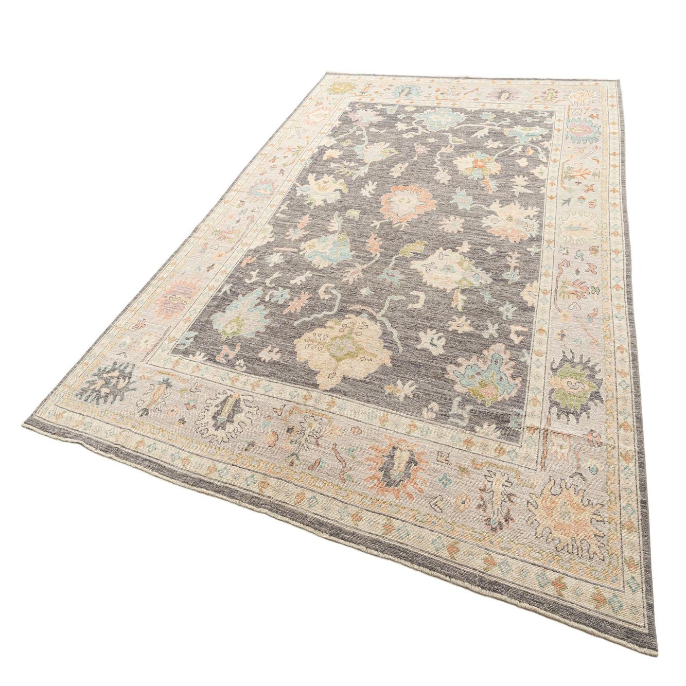 Handmade rectangular Oushak rug featuring a gray field with colorful Persian floral motifs and a light border.