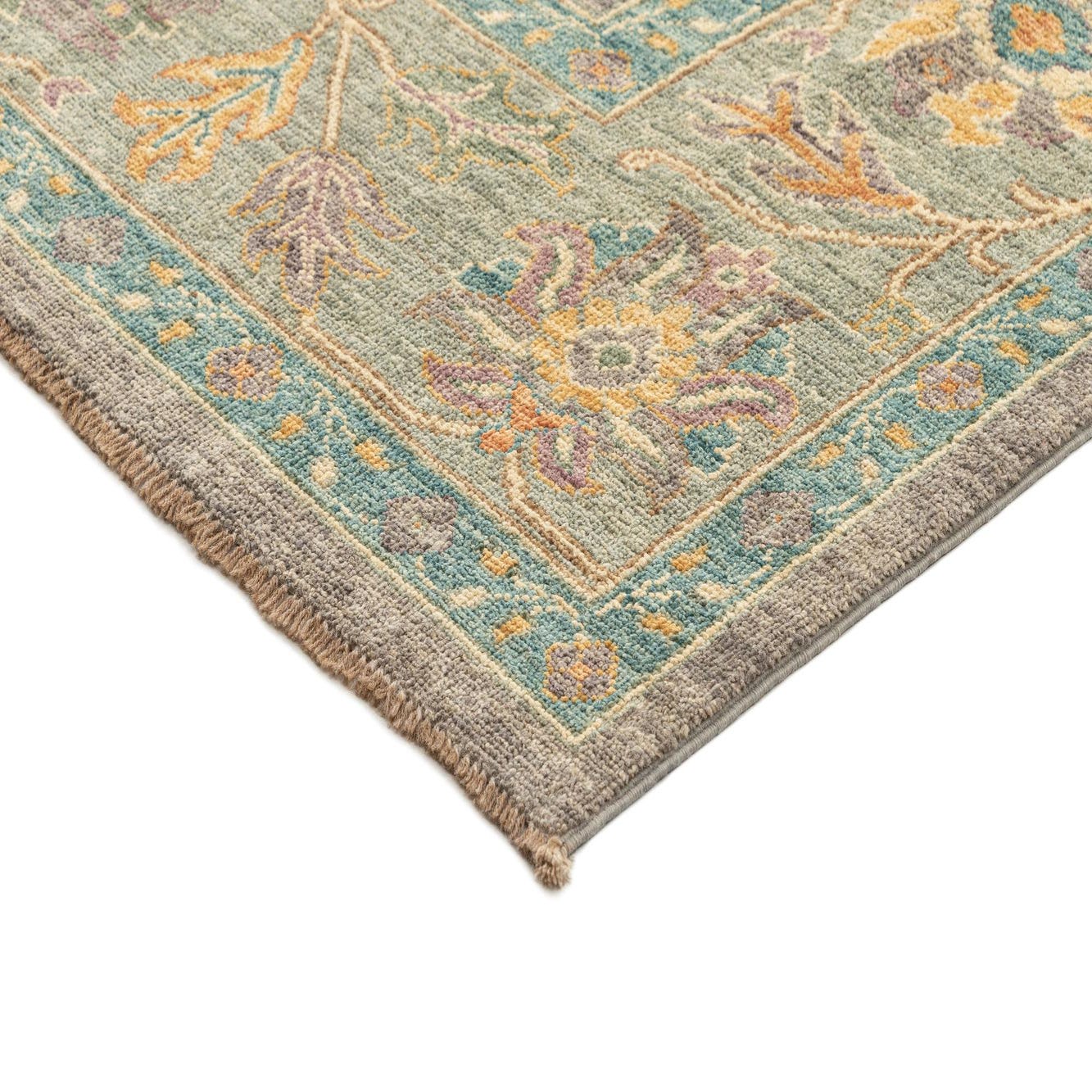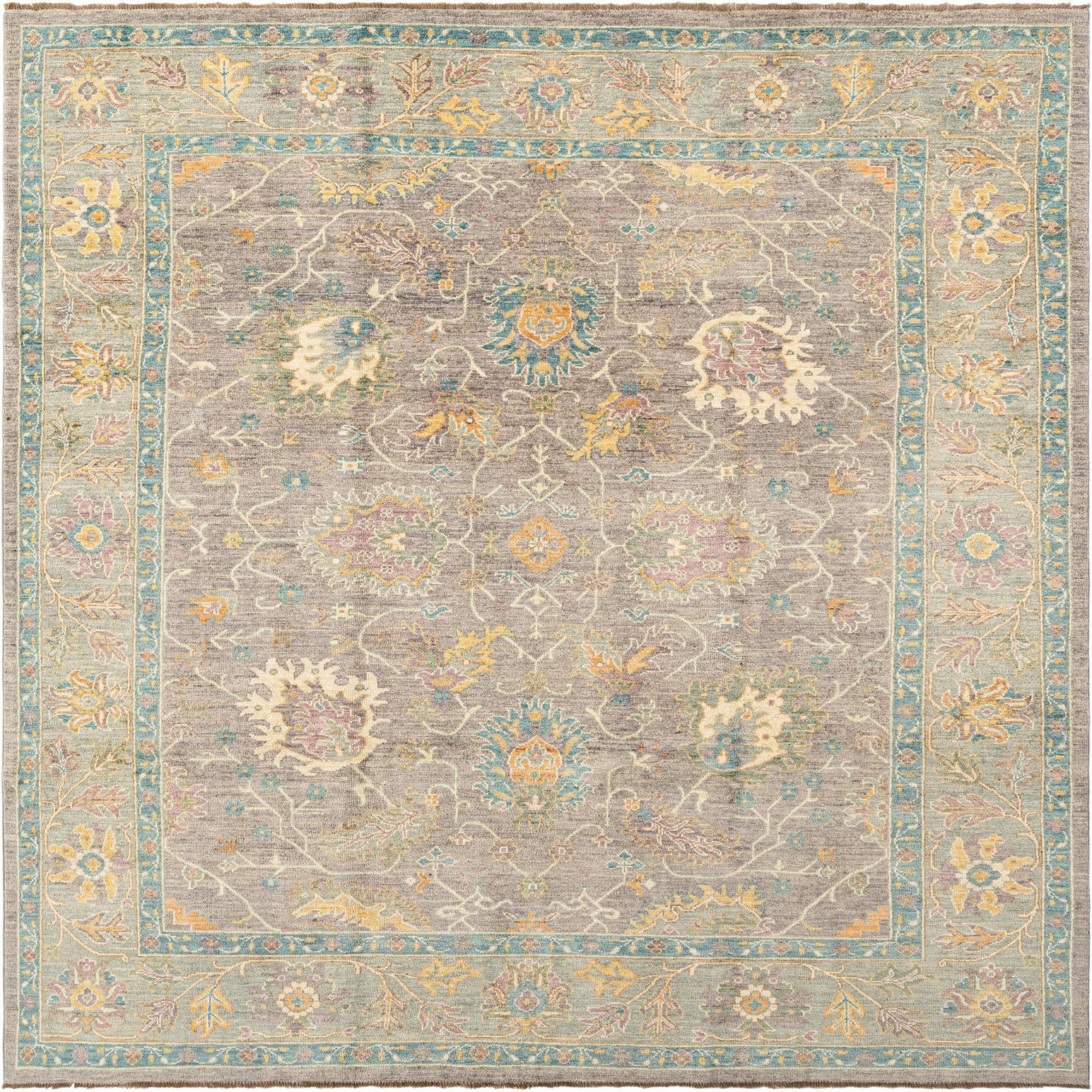 Handmade rectangular Oushak Persian rug in shades of gray with intricate floral and medallion patterns in blue, yellow, and subtle pastels, featuring a decorative border.