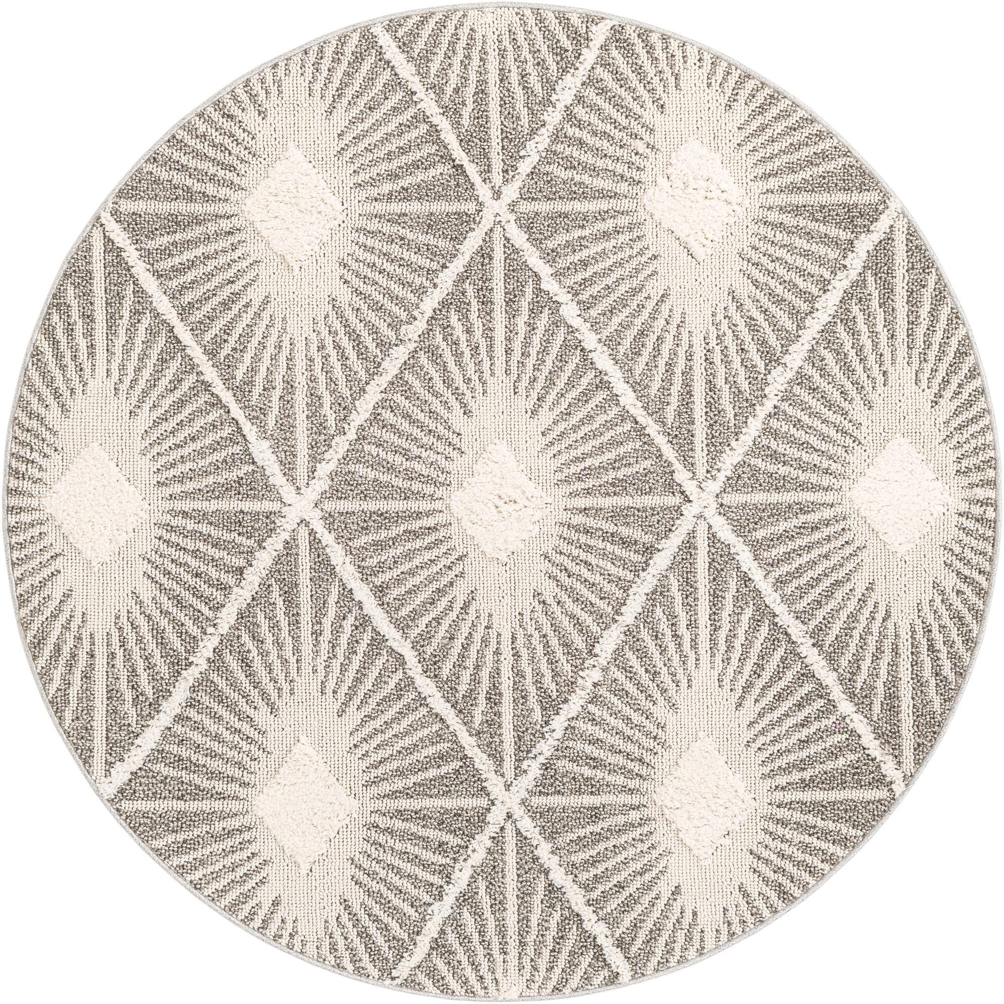 A round 5' 3" ivory and gray bohemian rug featuring a modern trellis pattern with textured high pile diamonds.