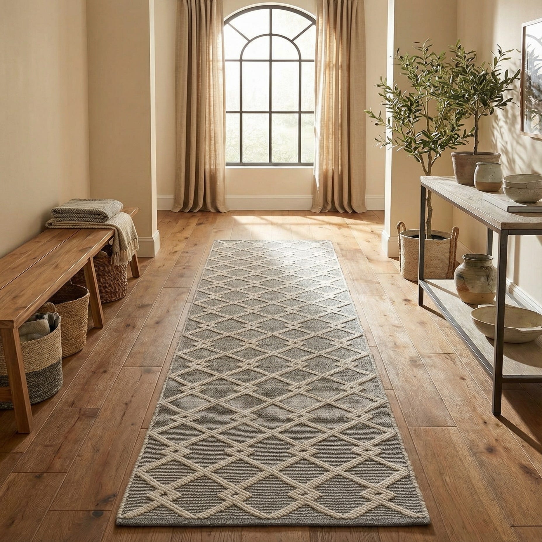 This runner works well in narrow, high-traffic zones where you want pattern and texture without heavy color—hallways, entryways, or alongside a bed. Pair it with light oak or warm gray floors and neutral upholstery for a layered, calm palette, or use it to soften sleeker metal and glass furnishings in a contemporary space. Its subtle contrast and tactile detail suit transitional, Scandinavian, or modern farmhouse interiors that favor clean lines with a touch of warmth.