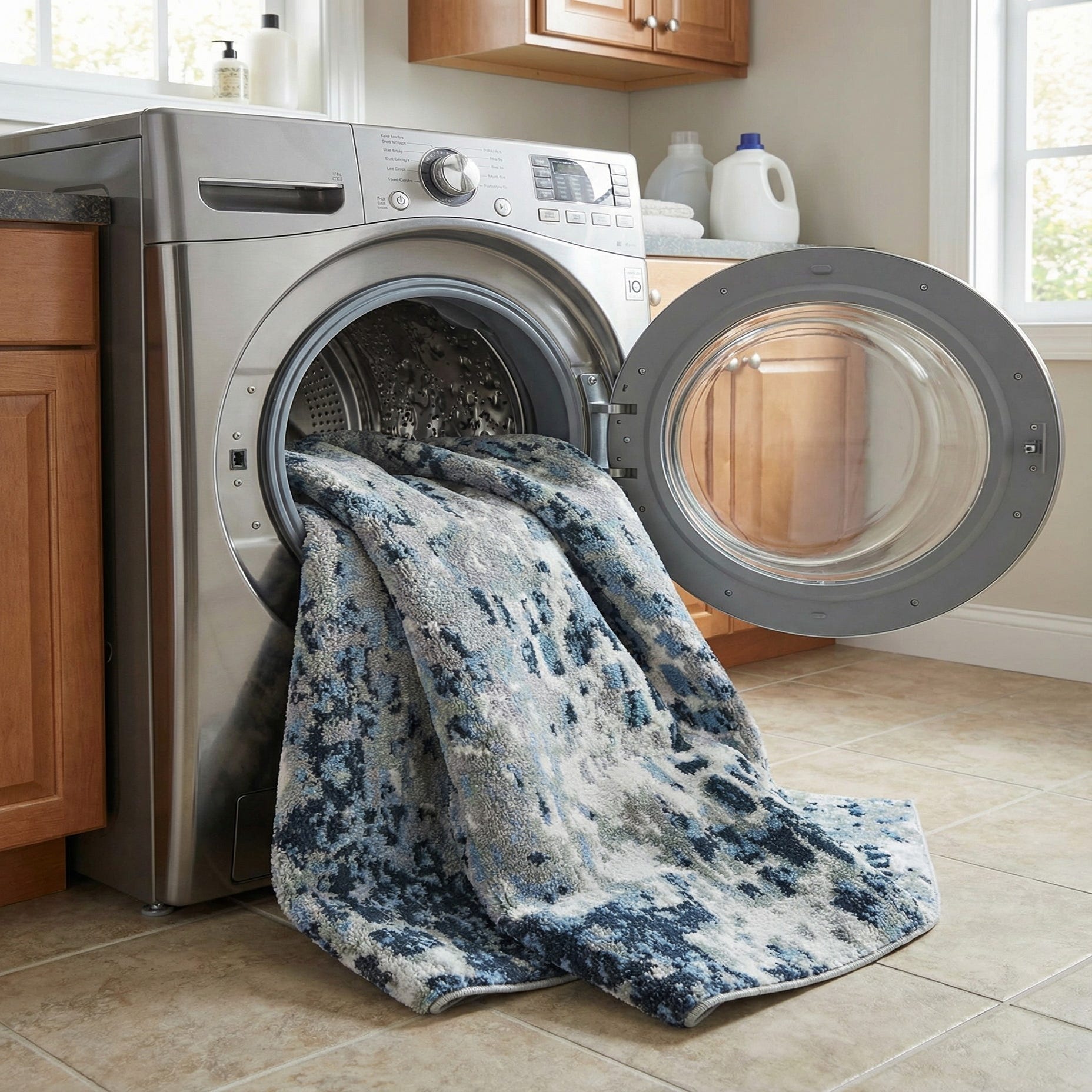 Machine made of 100% polyester. Place this rug to define a seating area in a modern living room, tuck it at the foot of a bed to add color and texture, or use it under a small dining or breakfast table for a casual, collected feel. It pairs naturally with light wood tones, neutral upholstery, and navy or soft blue accents, and also complements coastal, contemporary, or transitional interiors where an artistic, muted palette is desired.