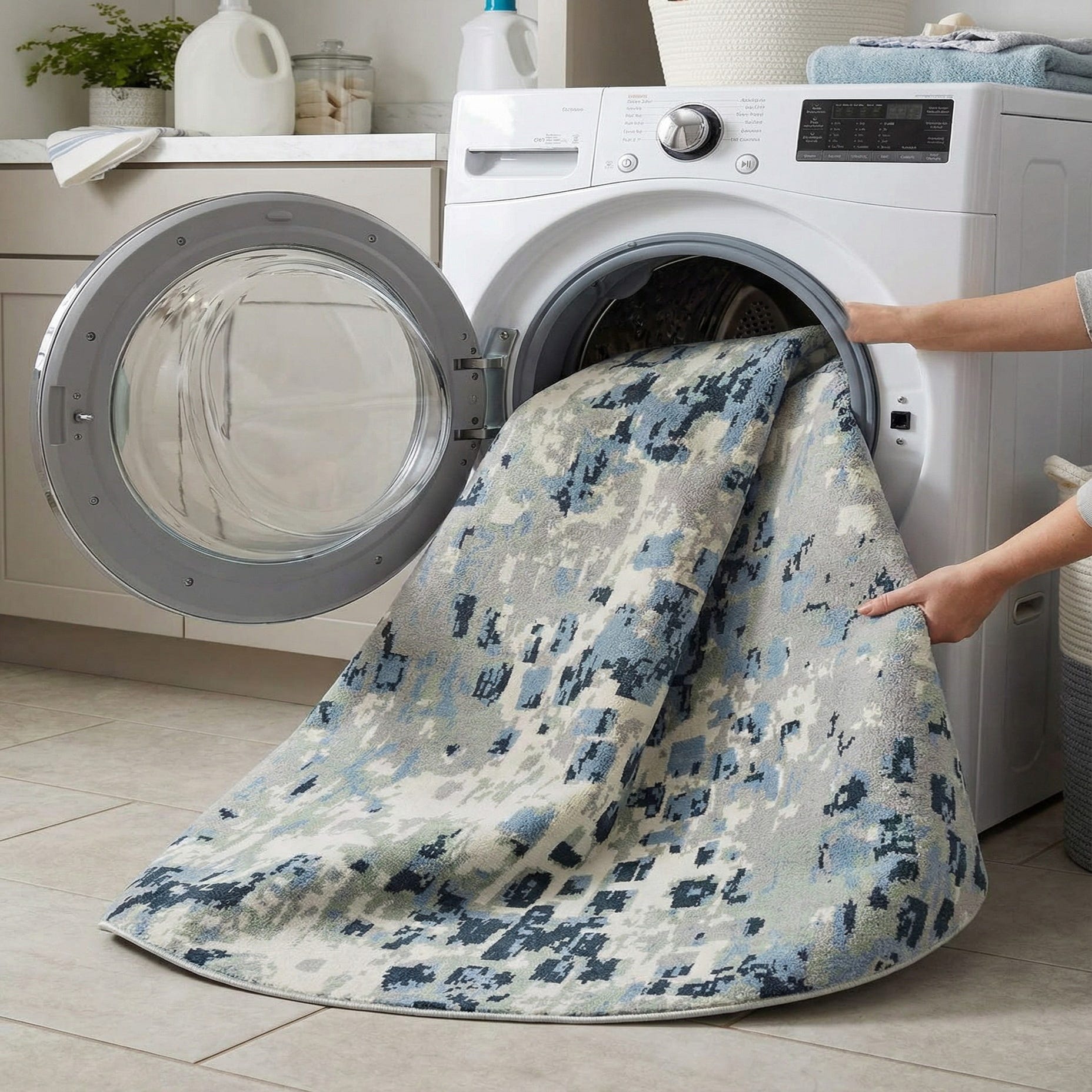 Machine-made of 100% polyester, the low-pile surface feels smooth and slightly plush underfoot while maintaining clear pattern definition. Place it under a round coffee table to anchor a seating group, layer it beneath a small dining set to add color without overwhelming the room, or use it in a bedroom or home office to introduce a cool, coastal-inspired palette. The colorway pairs especially well with light wood tones, navy upholstery, and ivory textiles for a calm, modern setting.
