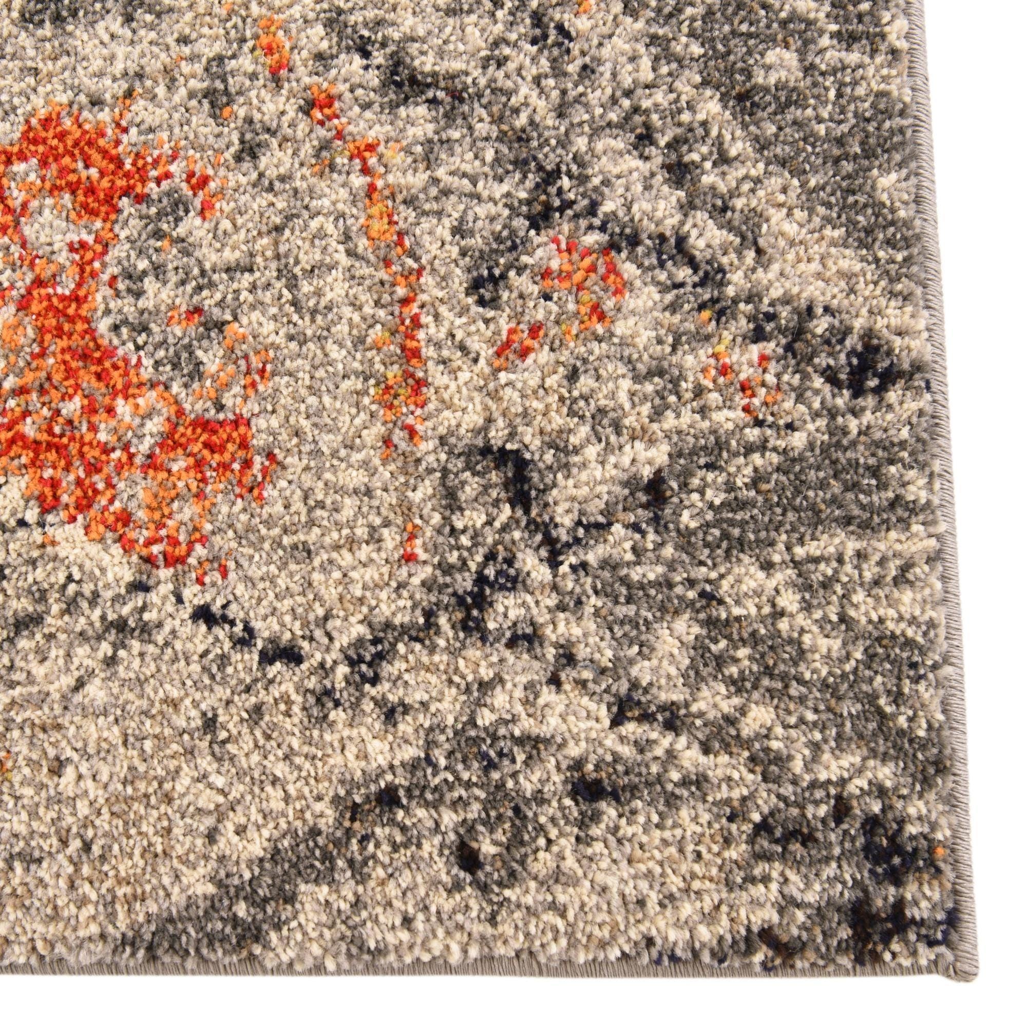 Primary color is Gray. Colors in this rug include: Gray, Black, Blue, Navy Blue, Orange, Red, Beige.