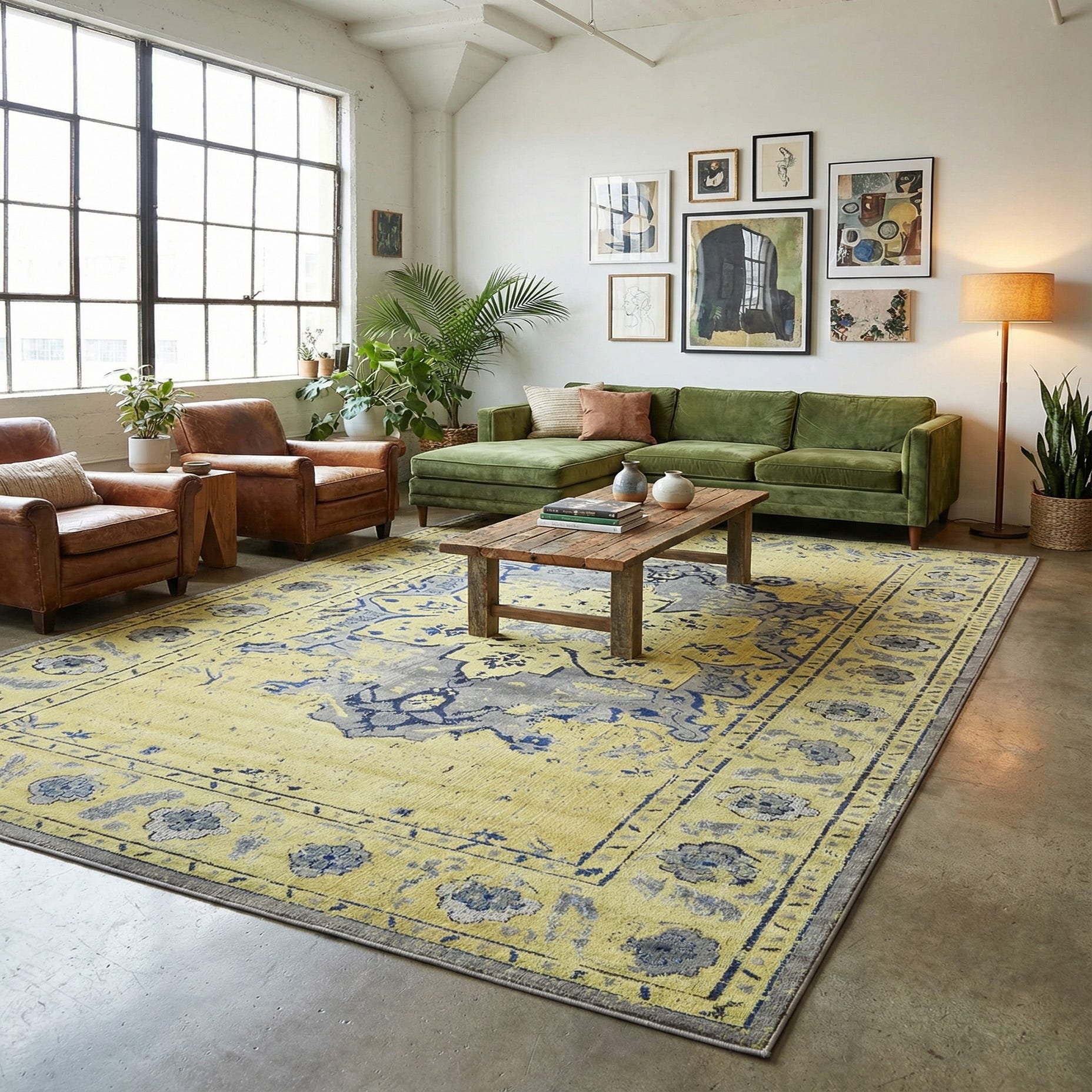 Made by Palace Rugs and machine woven from 100% polypropylene, the pile has a low, even feel with a subtle sheen that catches light across the gold and navy details. The texture reads smooth underfoot, offering a consistent surface that works well beneath furniture. Place this rug in a living room to ground a seating area, under a dining table to introduce pattern without competing with other finishes, or in an entryway to make a stylish first impression. It pairs naturally with warm metallic accents like brass or aged gold, cool gray upholstery, and navy or ivory textiles for a pulled-together look in transitional, contemporary-traditional, or modern farmhouse interiors.