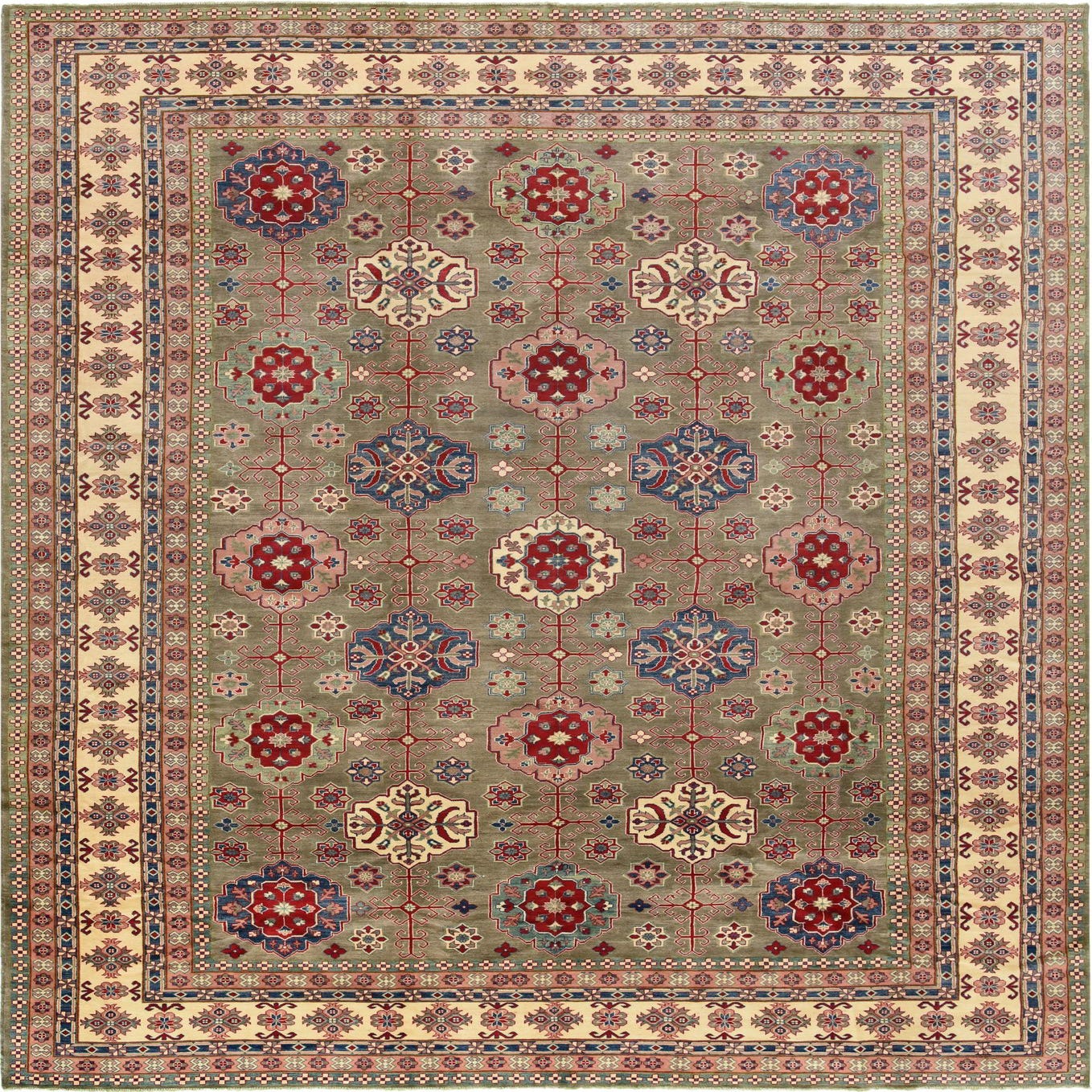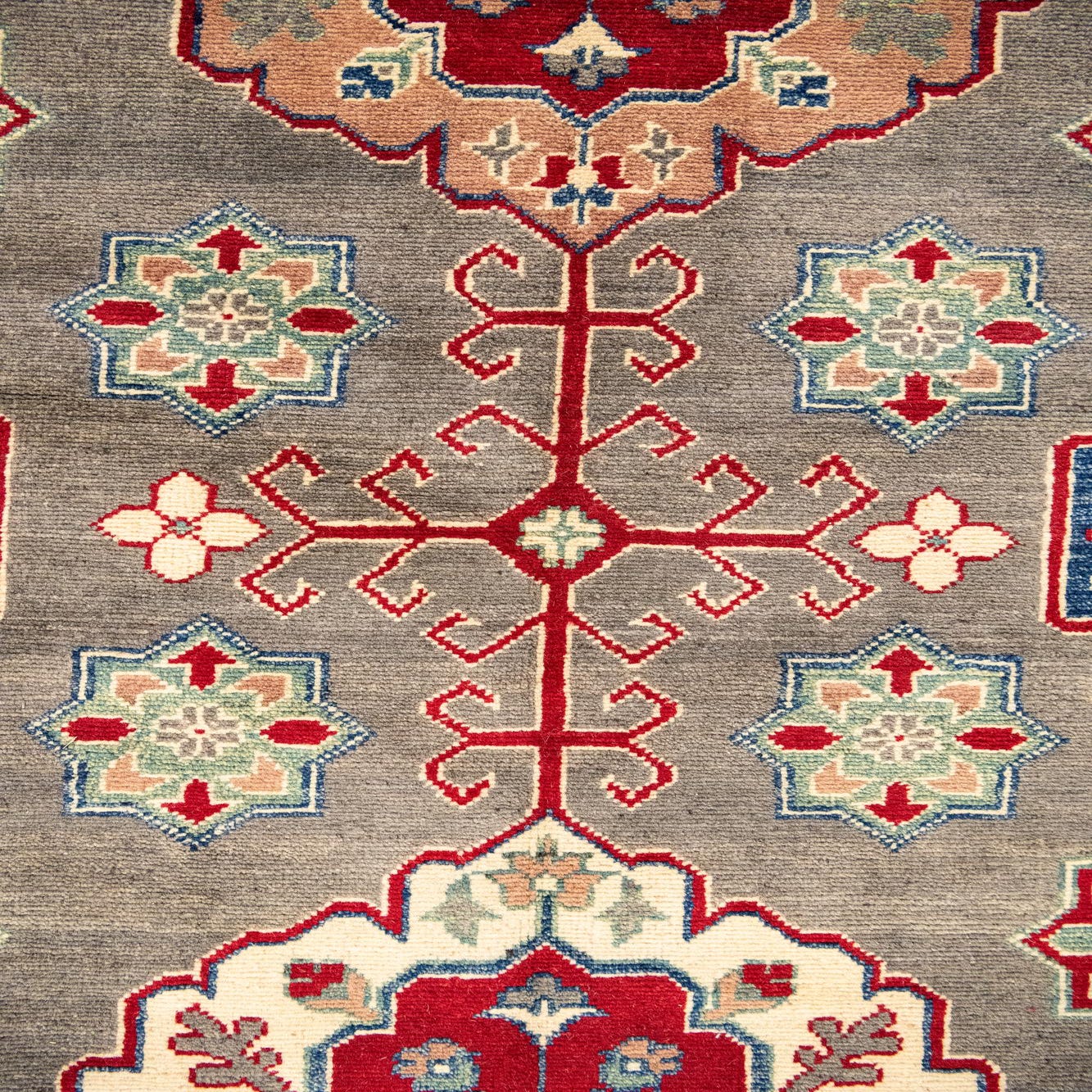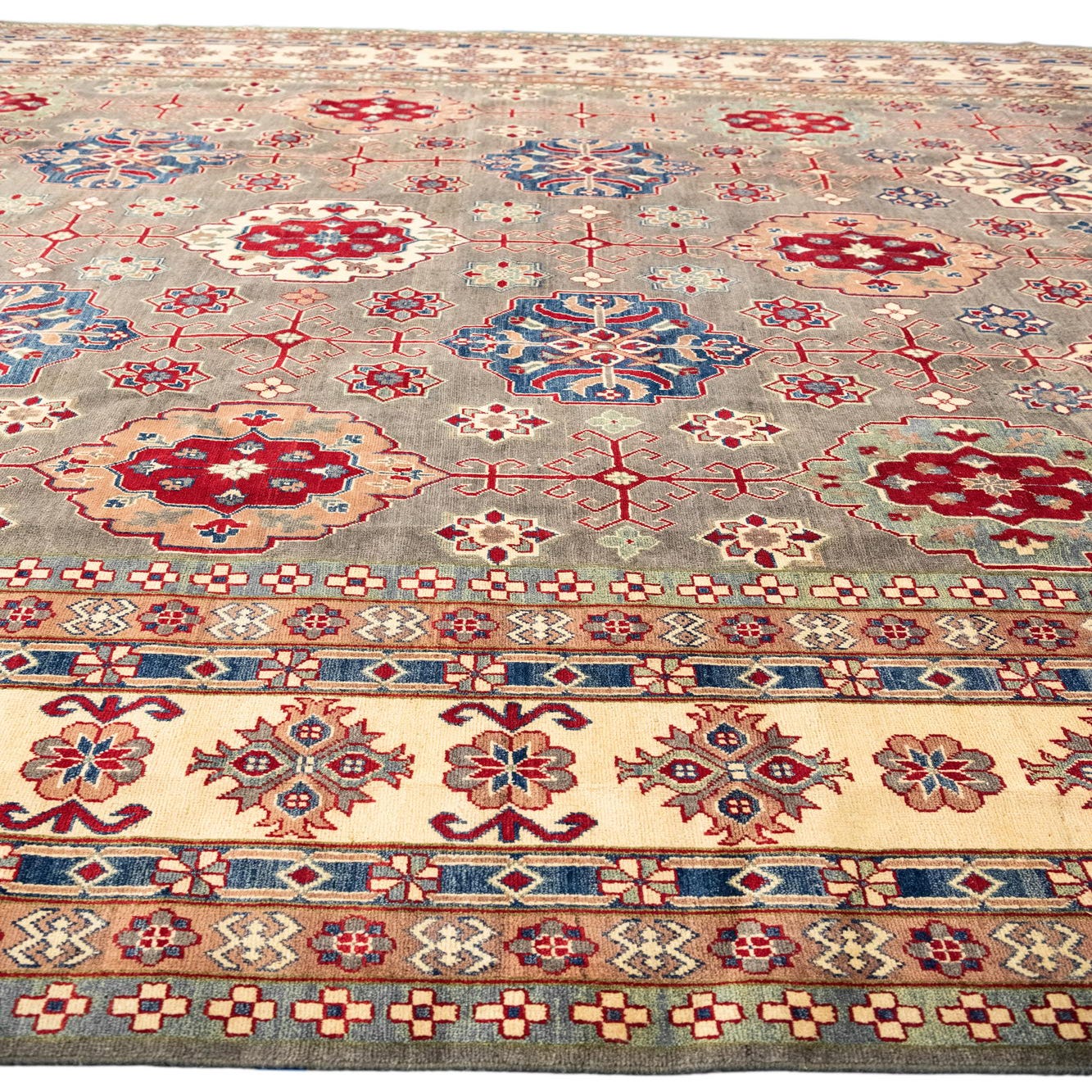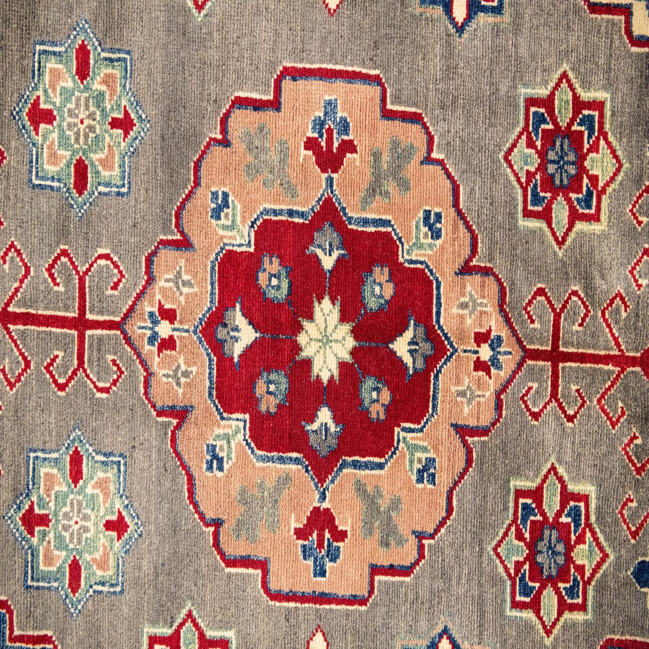 A large rectangular gray Modern Oriental Kazak rug with intricate red, blue, and cream medallion patterns and a detailed border.