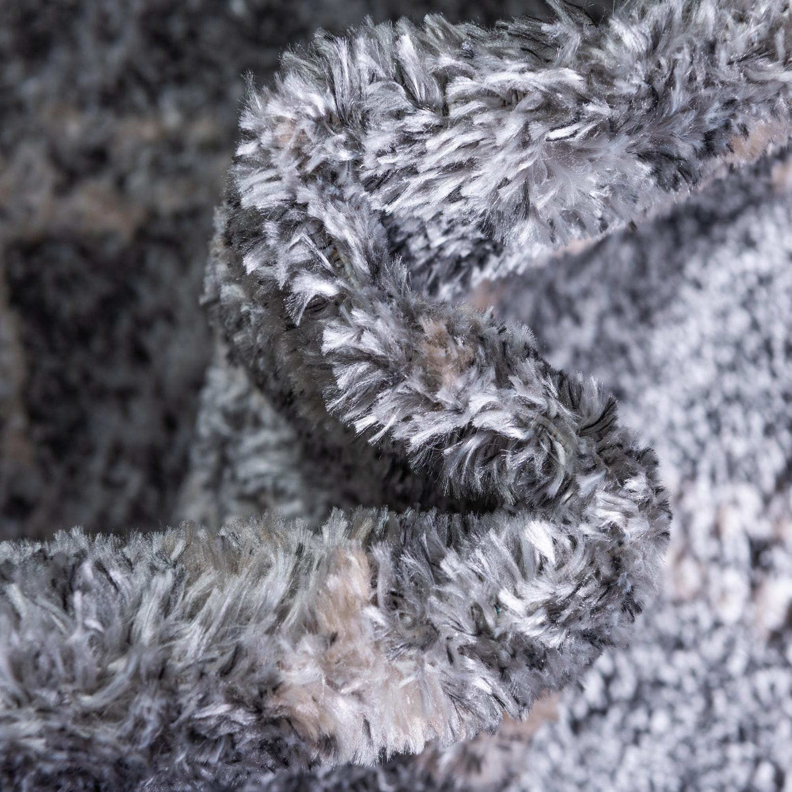 A soft, machine-made polyester pile creates a plush hand underfoot while a muted geometric motif adds visual interest without dominating the space. The round silhouette is grounded by a medium-gray background, with ivory diamond lattices and small inner medallions woven into the surface for a subtle, layered effect. The pile has a gentle, slightly variegated finish that catches light and gives the pattern depth and texture as you move across it.