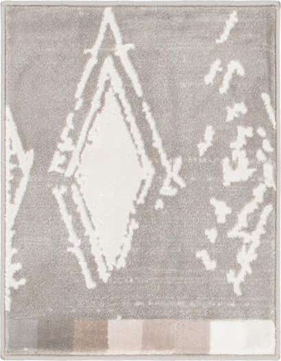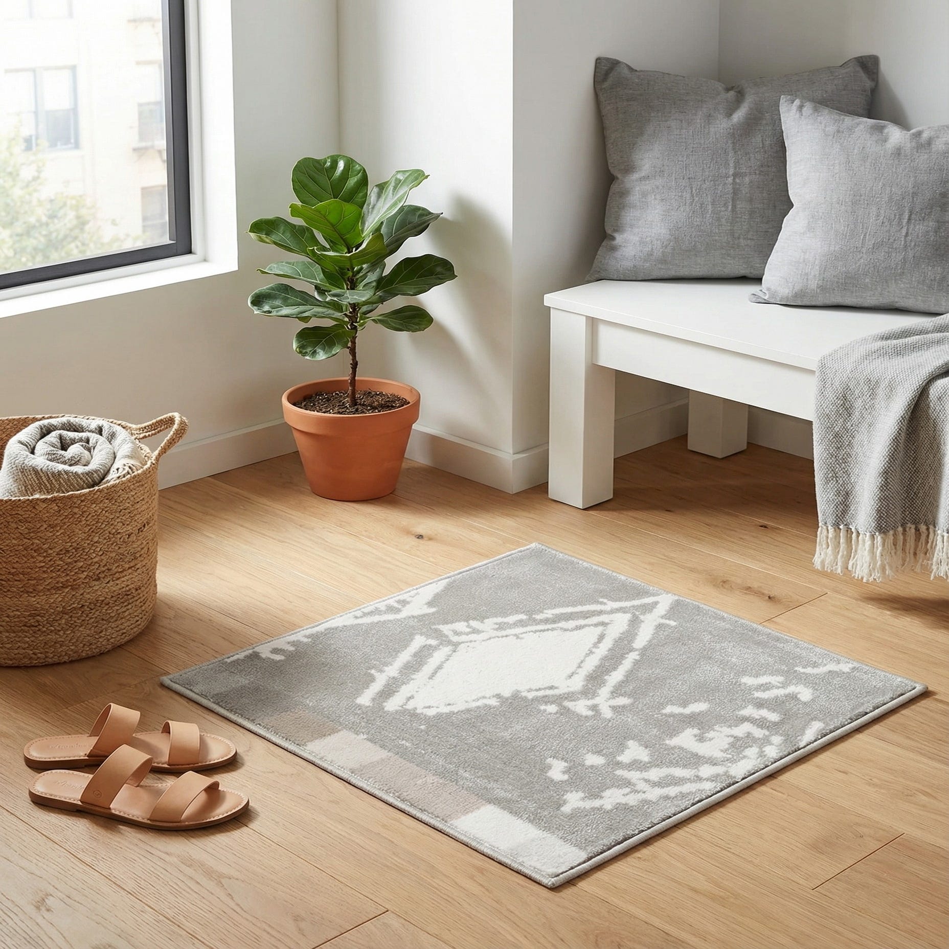 Soft underfoot with a refined, contemporary look, this rug pairs a warm gray background with ivory geometric motifs. A large diamond form anchors the composition while softened, slightly distressed edges and painterly accents create gentle movement across the field. The pile has a subtle plushness you can feel as you walk across it, and the ivory pattern provides a crisp contrast against the gray ground without overwhelming the design.