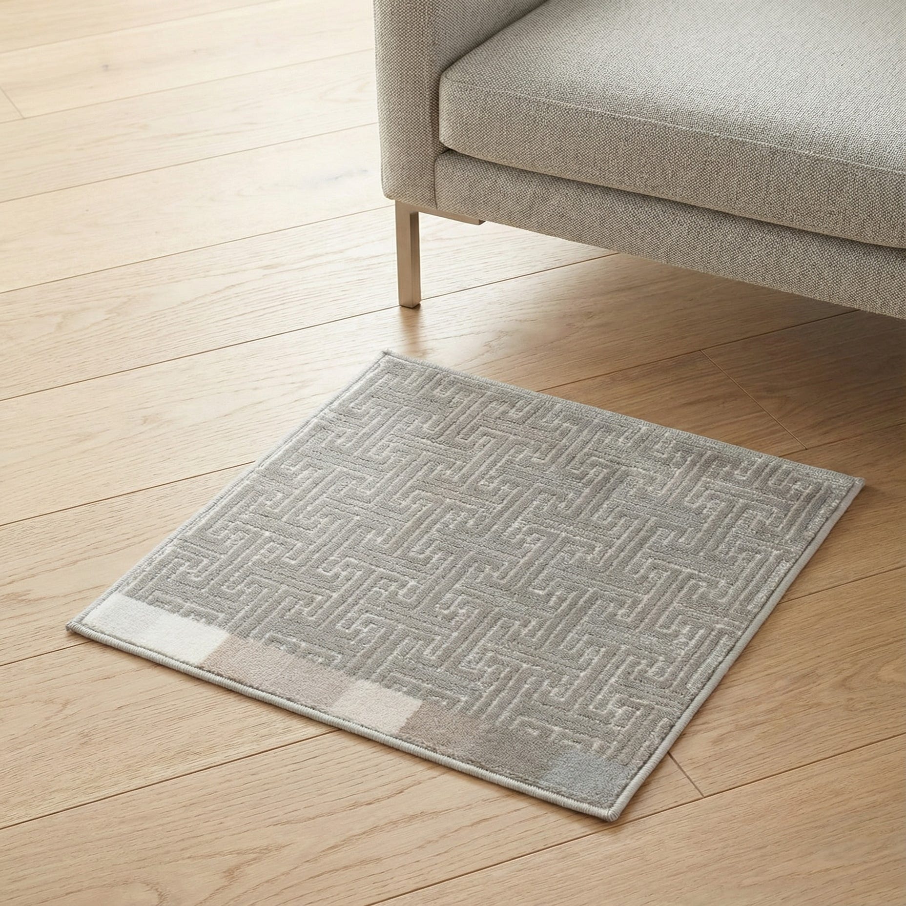 A low-contrast geometric pattern of interlocking lines and right angles gives this sample a modern, architectural look. The background is a soft gray with an ivory motif that rises slightly from the field, creating subtle depth and a gentle play of light. Machine made of 70% polypropylene and 30% polyester, the surface has a smooth, slightly plush feel with a soft sheen that highlights the pattern while remaining understated.