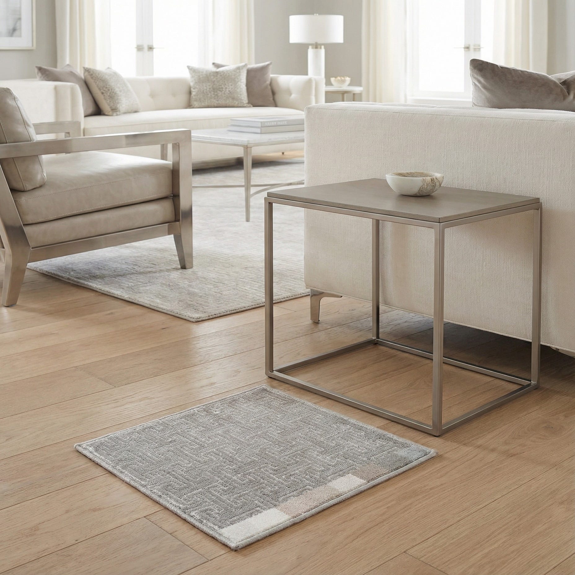 This rug works well in contemporary and transitional interiors—place it under a low-profile sofa and coffee table in a living room, in a bedroom to anchor neutral bedding, or in a home office to add refined texture without overwhelming the space. It pairs easily with light woods, metal accents, glass surfaces, and monochrome or pastel palettes for a calm, polished setting. This piece is a sample.