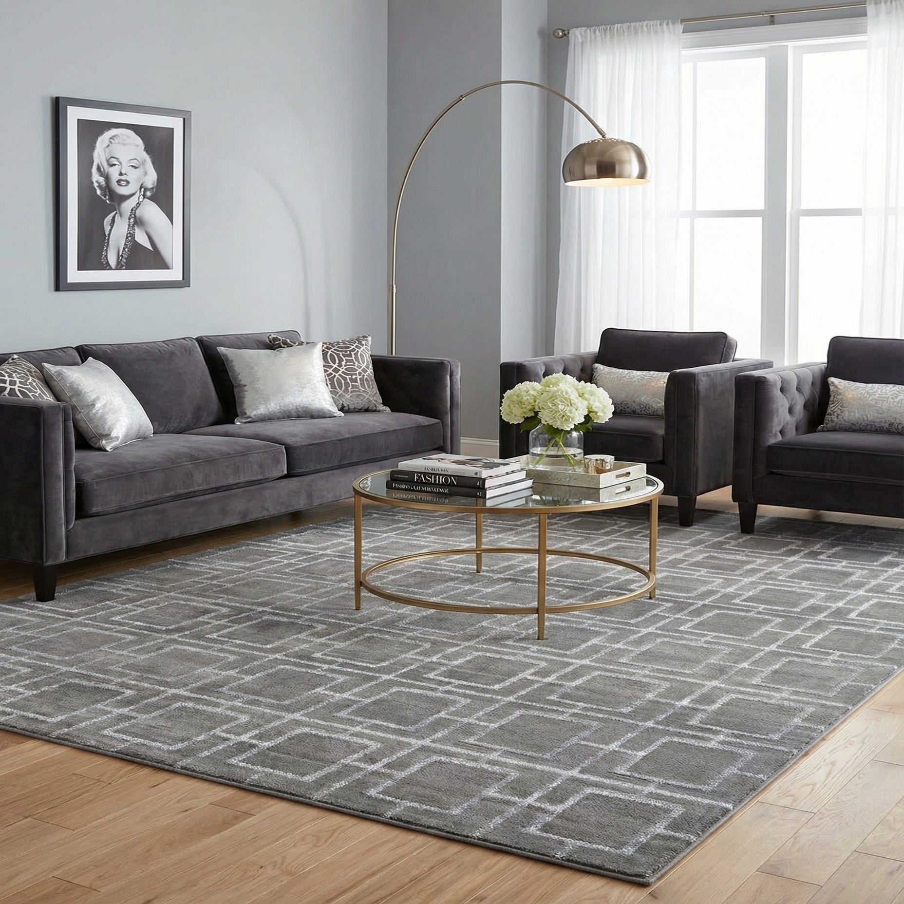A geometric trellis of overlapping squares and linear links forms a composed, modern pattern on a Gray Silver background. The Silver lines are slightly raised against the low-to-medium pile, giving clear tactile contrast — when you run your hand across it the cut-pile accents feel soft and defined while the ground pile remains smooth. Machine made from 70% polypropylene and 30% polyester, the rug offers a subtle sheen from the silver accents and a dense hand that holds the pattern clearly across the surface.