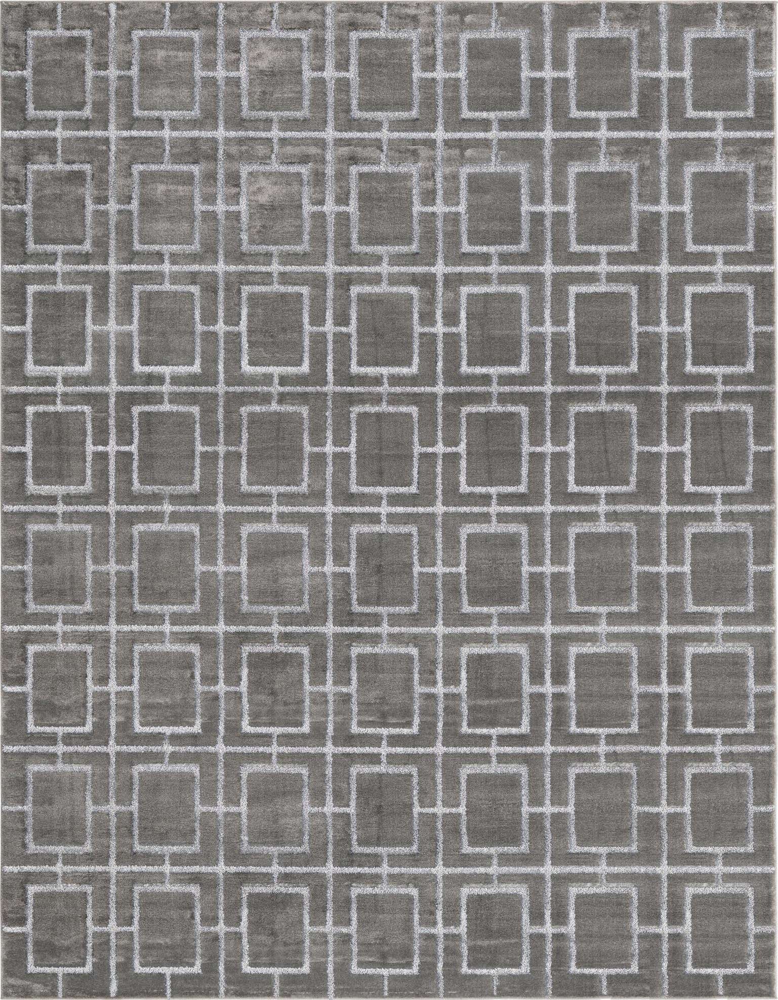A 10x13 rectangular gray area rug with a modern Hollywood glam trellis pattern, featuring a textured pile.