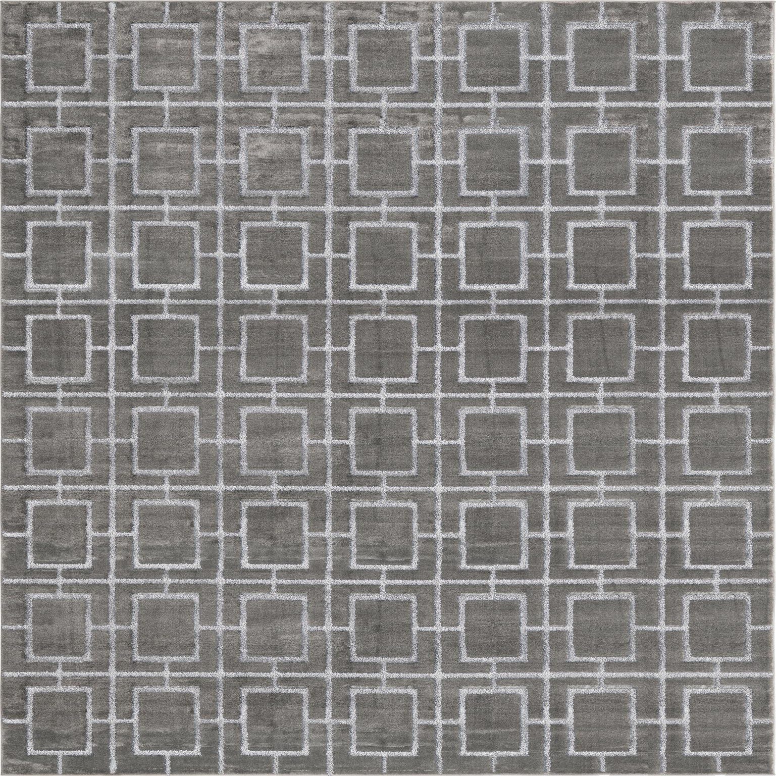 A geometric trellis of overlapping squares and linear links forms a composed, modern pattern on a Gray Silver background. The Silver lines are slightly raised against the low-to-medium pile, giving clear tactile contrast — when you run your hand across it the cut-pile accents feel soft and defined while the ground pile remains smooth. Machine made from 70% polypropylene and 30% polyester, the rug offers a subtle sheen from the silver accents and a dense hand that holds the pattern clearly across the surface.
