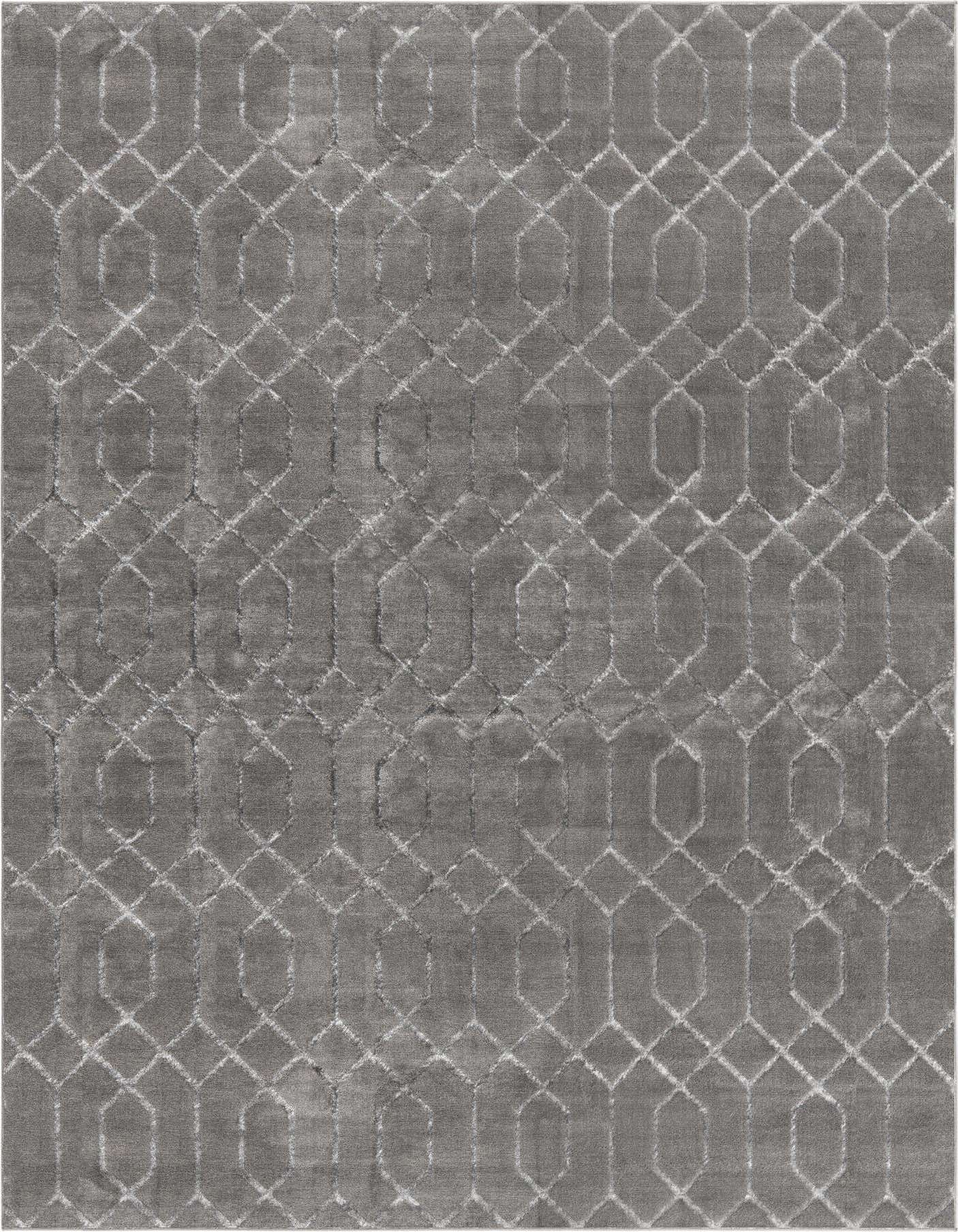 A 10x14 rectangular gray area rug with a textured Hollywood Glam trellis pattern, suitable for indoor spaces.