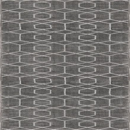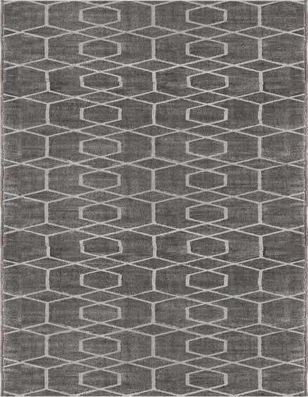 A linked geometric trellis of silver outlines runs across a Gray Silver background, forming a rhythmic pattern of octagons and diamonds that reads modern and measured. The trellis lines are slightly raised against a low-to-medium pile, so you can feel the pattern underfoot while the polyester fibers offer a soft hand and a subtle sheen that catches light without overwhelming the neutral palette.