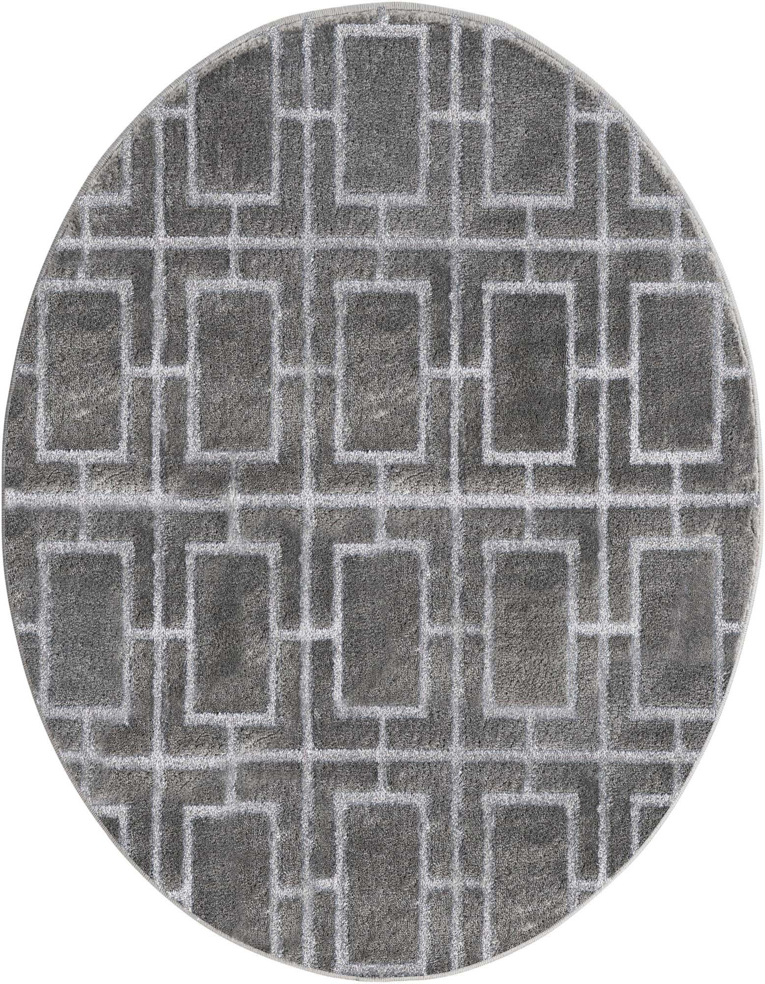A graphic trellis of rectangles and intersecting lines gives this round rug a clean, architectural look. The background is Gray Silver with silver accents that create a subtle contrast, and the pattern is defined by slight shifts in pile height that add gentle dimensionality. The surface reads soft and smooth to the touch, with a low-to-medium, dense pile that offers a comfortable hand and a refined, slightly lustrous finish.