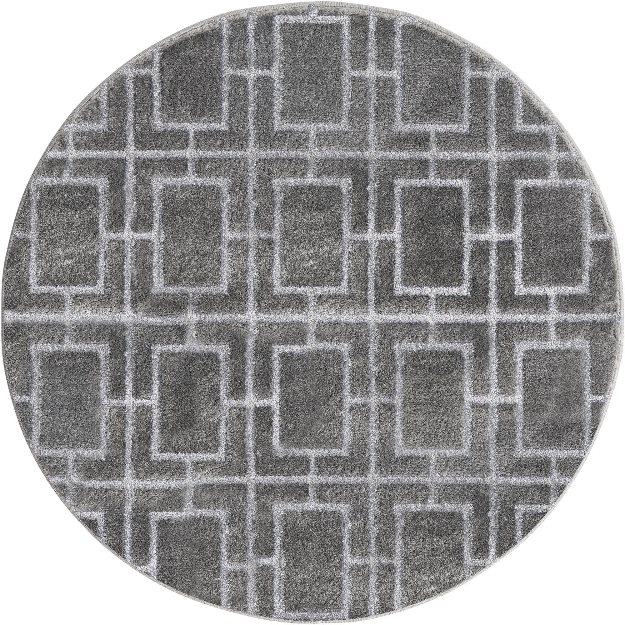 A 3' round gray area rug with a modern trellis pattern, featuring a textured high pile.